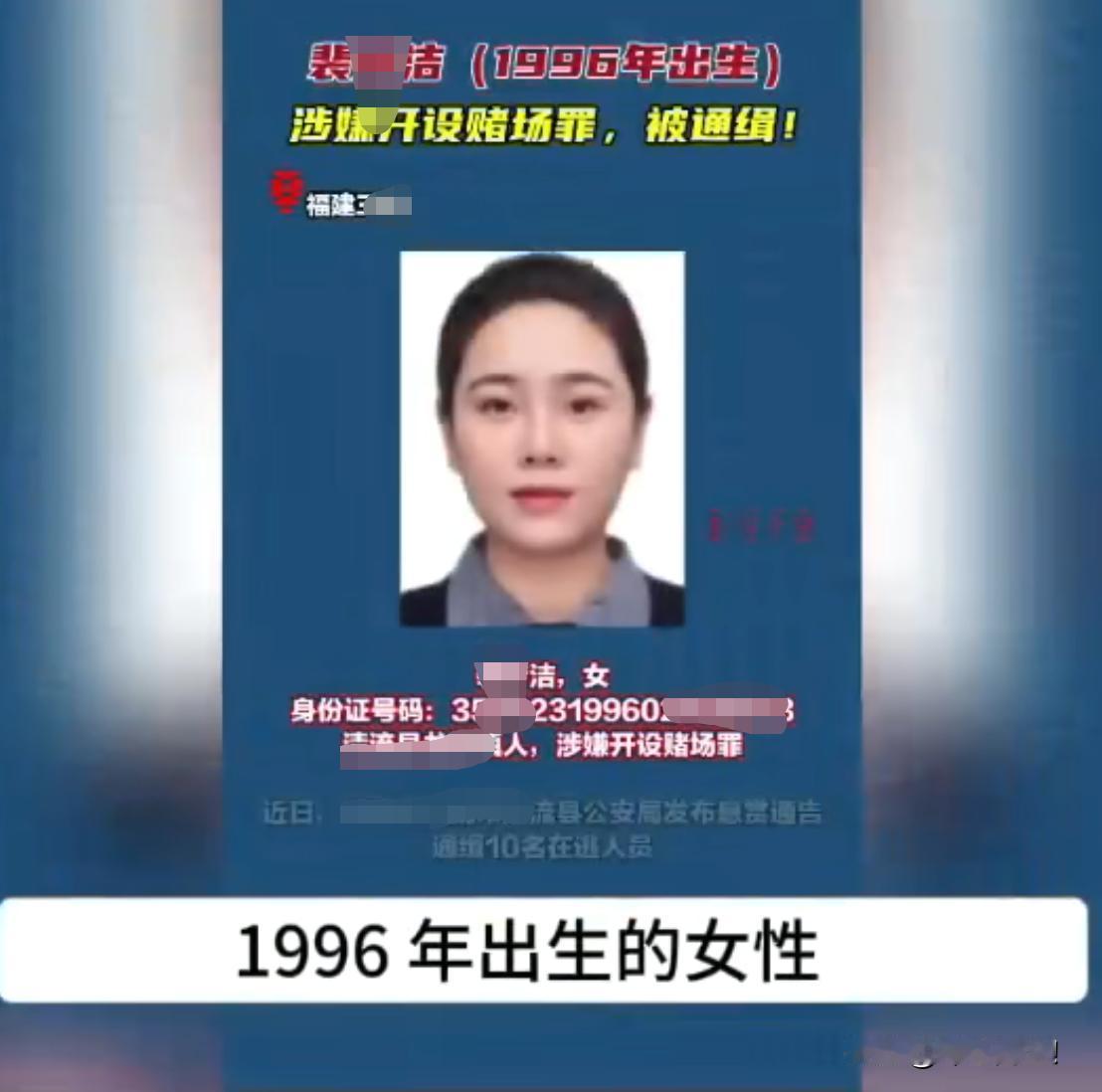裴某洁,1996年出生,涉嫌开设赌场罪被通缉!这么青春靓丽的人,处于人生的黄金期,却因涉嫌违法陷入逃亡困境,人生就这么毁了,只能用春春和自由来买单了。 法网恢恢,疏而不漏,什么时候能入法网?拭目以待,欢迎你的评论!
