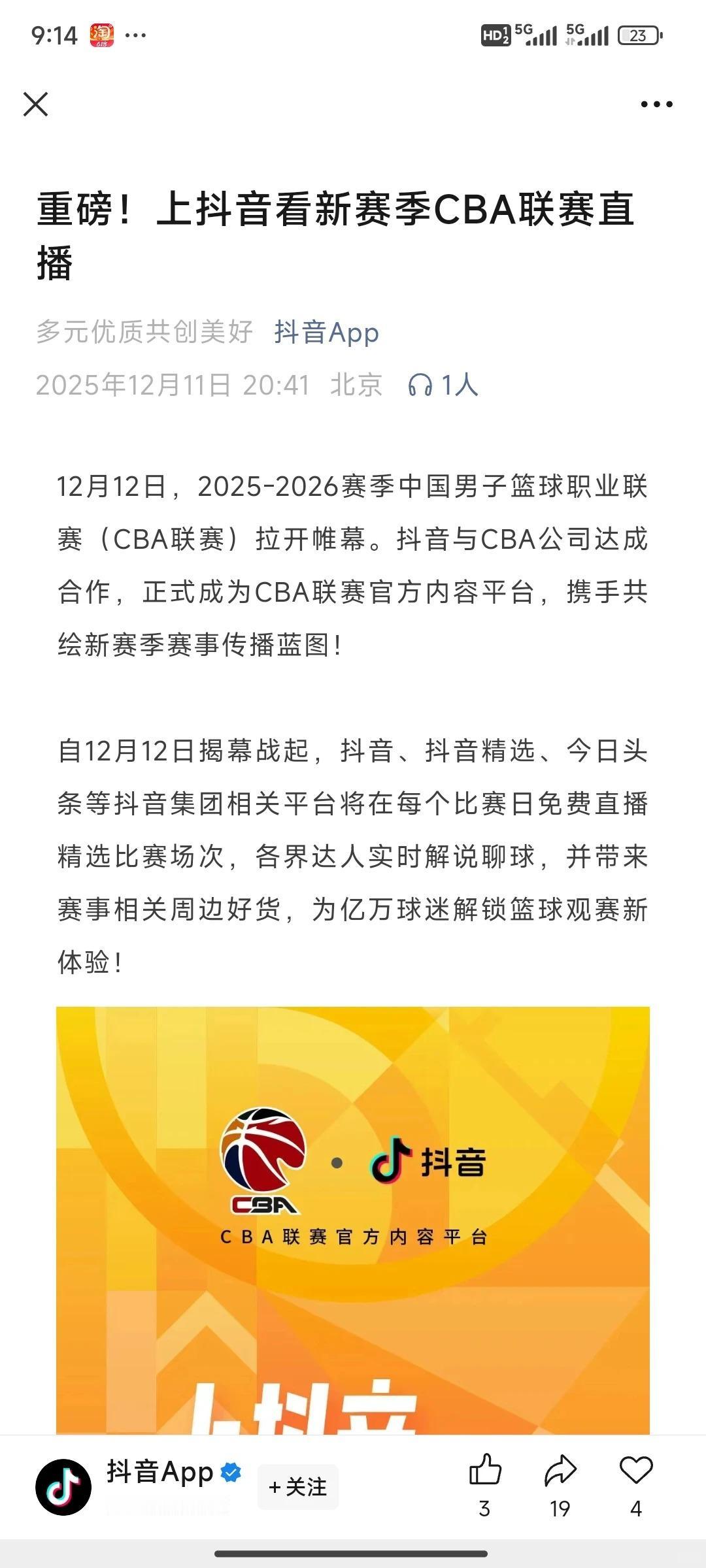 提醒各位!今晚CBA揭幕战在哪能看 最新消息,今晚CBA揭幕战 浙江方兴渡 vs 山西汾酒 的比赛将在抖音免费直播,19:30分在抖音搜索CBA比赛应该就能找到。大家别错过