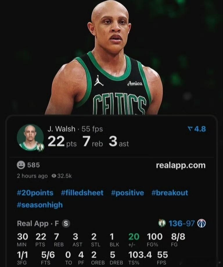 乔丹转世?绿军无眉大侠近5战堪比乔丹!这个长得像死侍的男人!不是又半场100%命中率!最近5场有3场半场百分百命中率!5场合计出手37次运动战命中了30次,命中率81%!三分球合计12投9中,命中率75%!罚球合计8投7中,关键是他是个防守球员!都快打出乔丹了!就在今天凯尔特人客场雄鹿的比赛中,尽管绿军以101-116告负,五连胜被终结,但乔丹沃尔什打出了生涯又一代表作,这位被称为无眉大侠的球员!他今天首发出战32分钟,以极高的效率10投8中,其中三分球4投3中,罚球1中1,砍下全队第二高的20分,并贡献了8个篮板和3次抢断。尤为亮眼的是,他在上半场便7投全中,手感火热。这场比赛集中展现了他作为顶级“3D”(三分与防守)优秀潜质!在进攻端高效且不占球权,在防守端存在感十足,真的太强了!沃尔什本赛季至今的表现,实现了数据上的全面飞跃。在出战的21场比赛中(其中12场首发),他场均出战21分钟,能够贡献7.7分5篮板1助攻1.2抢断和0.6盖帽。更令人惊叹的是他的投篮效率——投篮命中率高达60.2%,三分命中率更是高达48.7%,罚球命中率也有81.8%。这与他在新秀赛季40%的投篮命中率和22.2%的三分命中率相比,确实是脱胎换骨了。他的本赛季最高光时刻是12月5日对奇才那场比赛。他全场8次出手全部命中,弹无虚发,砍下22分7篮板3助攻2抢断1盖帽的全面数据。凭借这一表现,他以21岁278天的年龄,成为凯尔特人队史上以100%命中率砍下20+得分的最年轻球员,创造了一项队史纪录!沃尔什对于绿军的价值,最直观地还是体现在战绩上。自他被提上首发的13场比赛中绿军只输了3场!胜率高达77%,是绿军能从东部垫底到如今东部第三的绝对功臣!一项高阶数据更能说明他的影响力,当沃尔什在场时,凯尔特人平均每百回合可以净胜对手12.9分,这就直接印证了他在攻防两端带来的贡献有多大。他的防守并非虚无,而是有数据支撑的,本赛季,在他的主防下,马克西9投仅1中,坎宁安6投0中,爱德华兹和哈登均为7投3中,多位明星球员的进攻效率大打折扣。他拥有1米98的身高和惊人的2米18臂展,配合出色的横移速度,能够从一号位防到四号位。他的防守压迫性非常强,甚至迫使湖人在赛前就必须专门调整战术,让主攻手里夫斯部分时间改打无球以作应对!在那一场小里也被防得半场只有7投2中!他的亮点不止在防守端,在进攻端,他也完美符合现代篮球对侧翼球员的需求。他不再是从前那个外线投射不稳的毛糙小子了,本赛季48.7%的三分命中率让他成了可靠的三分射手。同时,他又擅于利用空切和反击,进攻选择极其聪明且高效,在不占用过多球权的情况下总能把握住机会,不得不说绿军又捡到一块冠军拼图了!但是其实沃尔什的职业生涯故事还是挺励志的!他出生于2004年3月3日,今年21岁跟小编一样大,本赛季是他的职业生涯第三个赛季。幼年时,他因患有普秃症导致头发和眉毛全部脱落,曾因此深感自卑,长期戴着帽子。是篮球让他重新找到了自信和归属,并成长为全美高中排名第11的明星球员。在阿肯色大学度过一年后,他因外线投篮短板在2023年选秀大会跌至次轮,于第38顺位国王选中,随后被交易至凯尔特人,国王现在估计肠子都悔青了!即便随队在新秀年夺得总冠军,但他并未获得太多表现机会。在本赛季初,他前六场比赛的总出场时间甚至没超过5分钟!转机来自11月2号对阵火箭的垃圾时间,他抓住机会替补出场砍下10分,敲开了轮换阵容的大门!此后,他凭借“疯狗般”的防守和日益精进的投篮,牢牢抓住了轮换的机会,完成了从“饮水机球员”到“改变比赛走向”的逆袭之路!相信他近期的亮眼表现已经吸引了各位球探的双眼!这位从患有普秃症的自卑少年,用攻防一体的表现赢得了首发也让全联盟为之颤抖!他崛起故事还未结束。待塔图姆伤愈归来后,完整体的绿军又将重返争冠行列,期待沃尔什能够继续稳定发挥,相信他离第一份高薪不远了!凯尔特人沃尔什乔丹死侍