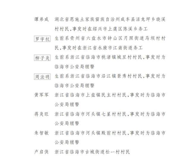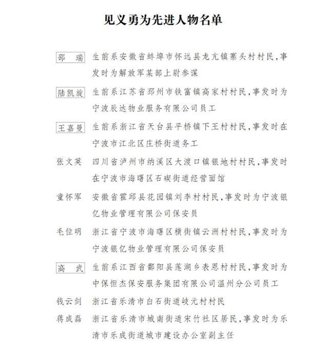 该份文件指出,为广泛践行社会主义核心价值观,大力弘扬社会正气,倡导见义勇为,激励广大人民群众与违法犯罪行为作斗争,积极参与抢险救灾,根据《浙江省见义勇为人员奖励和保障条例》《浙江省行政奖励暂行办法》,经省政府常务会议审议通过,决定为邵瑞、陆凯旋、王嘉曼、高武、罗宇权、柳子炎、周法明追记一等功,为张文英、童怀军、毛位明、钱云剑、蒋成磊、谭弟咸、黄军军、蒋炎旺、朱智敏、卢启侠记一等功。
