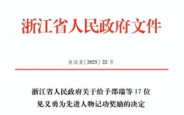 12月12日,浙江省人民政府网站发布《浙江省人民政府关于给予邵瑞等17位见义勇为先进人物记功奖励的决定》。
