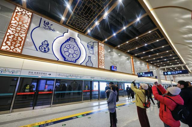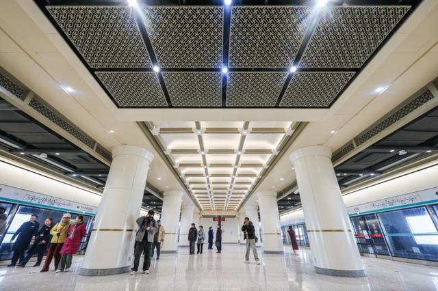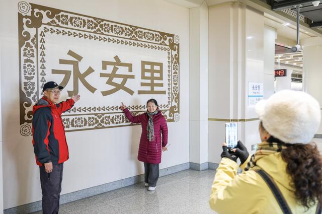 新站颜值高、有看点。永安里站装修采用新中式风格,以米色为主色调,衬以褐色线条与顶部藻井造型,展现中式空间之美。站内布置“东方之韵”主题壁画,琉璃瓦片、古建筑剪影上墙,展现古都文化底蕴与都市活力。