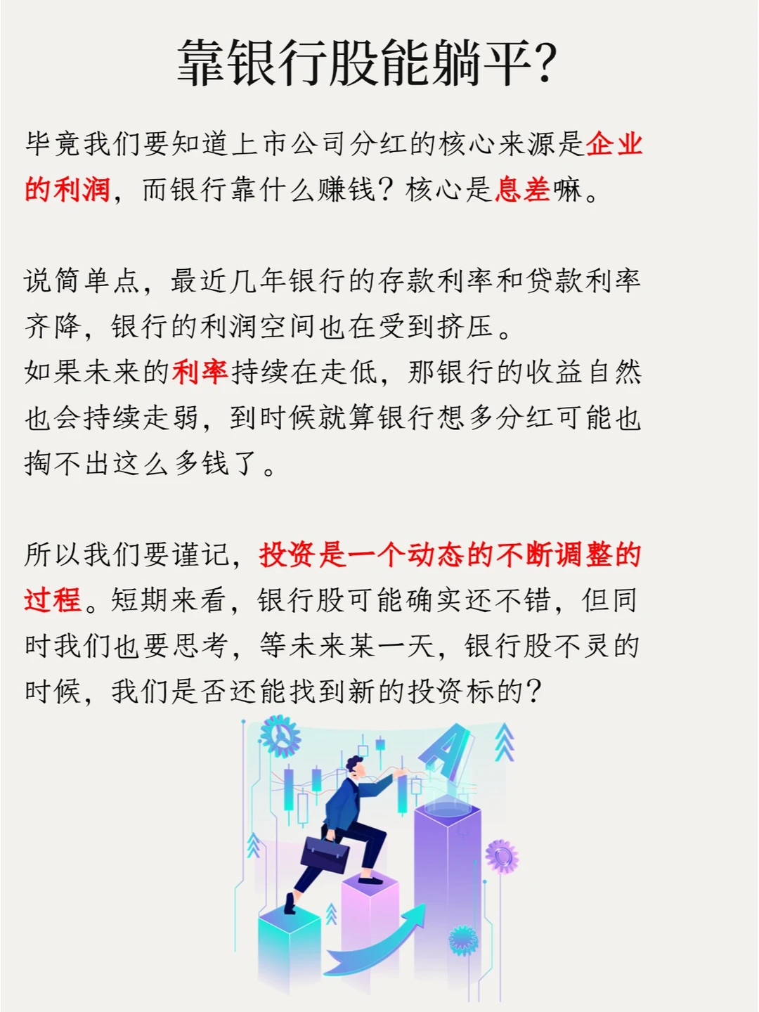 毕竟我们要知道上市公司分红的核心来源是企业的利润,而银行靠什么赚钱?核心是息差嘛。说简单点,最近几年银行的存款利率和贷款利率齐降,银行的利润空间也在受到挤压。如果未来的利率持续在走低,那银行的收益自然也会持续走弱,到时候就算银行想多分红可能也掏不出这么多钱了。