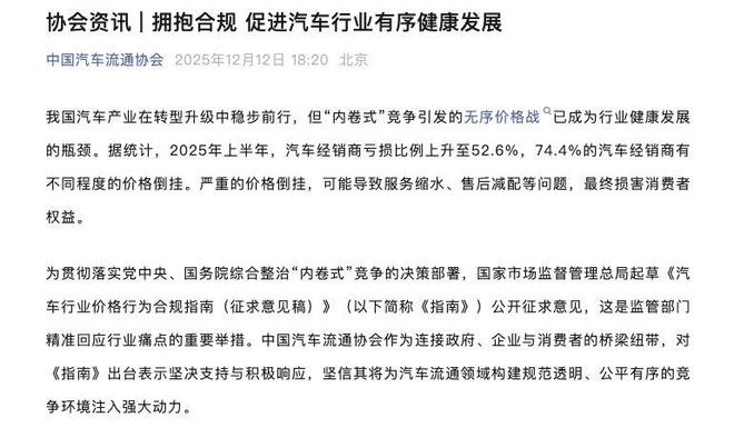“《征求意见稿》明确禁止低于成本销售、价格串通等不正当竞争行为,划定市场红线,将引导行业竞争从‘拼价格’的低层次内卷,回归‘拼技术、拼服务、拼价值’的良性轨道,从根本上修复产业生态。”中国汽车流通协会方面称。
