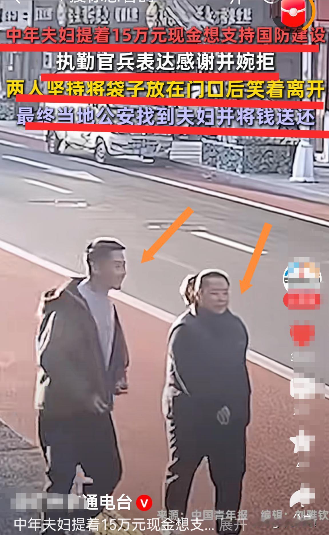 曝光|山东一对夫妇携15万巨款到部队,想为国防建设贡献一份力量,将巨款放在营区门口就跑,后来还是通过公安机关才找到这对夫妇。 评心而论:没有宏大的口号,只有最真实的行为,把对国防建设的支持,对军人的崇敬,藏进了15万巨款的沉甸甸心意里!这份热忱和纯粹,远比15万巨款更有力量!给这对夫妇点赞!