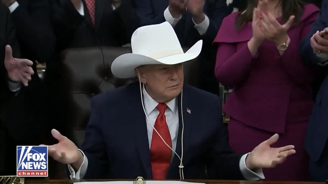 “你一定要拍张照片” 美国冰上奇迹奥运金牌得主代表队成员向特朗普赠送纪念牛仔帽,川普接过并戴上,全场一片笑声。还别说,挺有型的[呲牙]