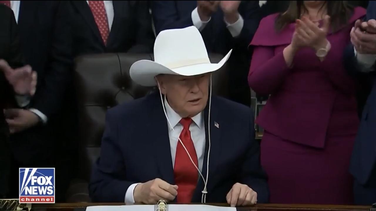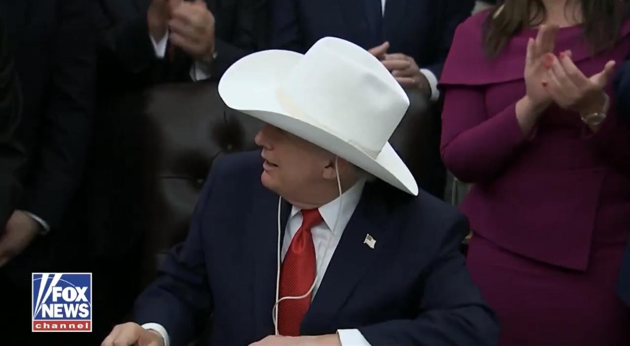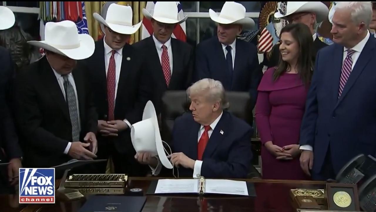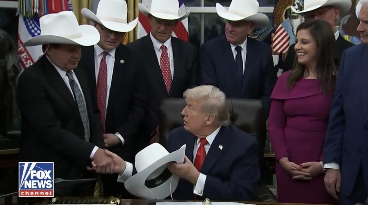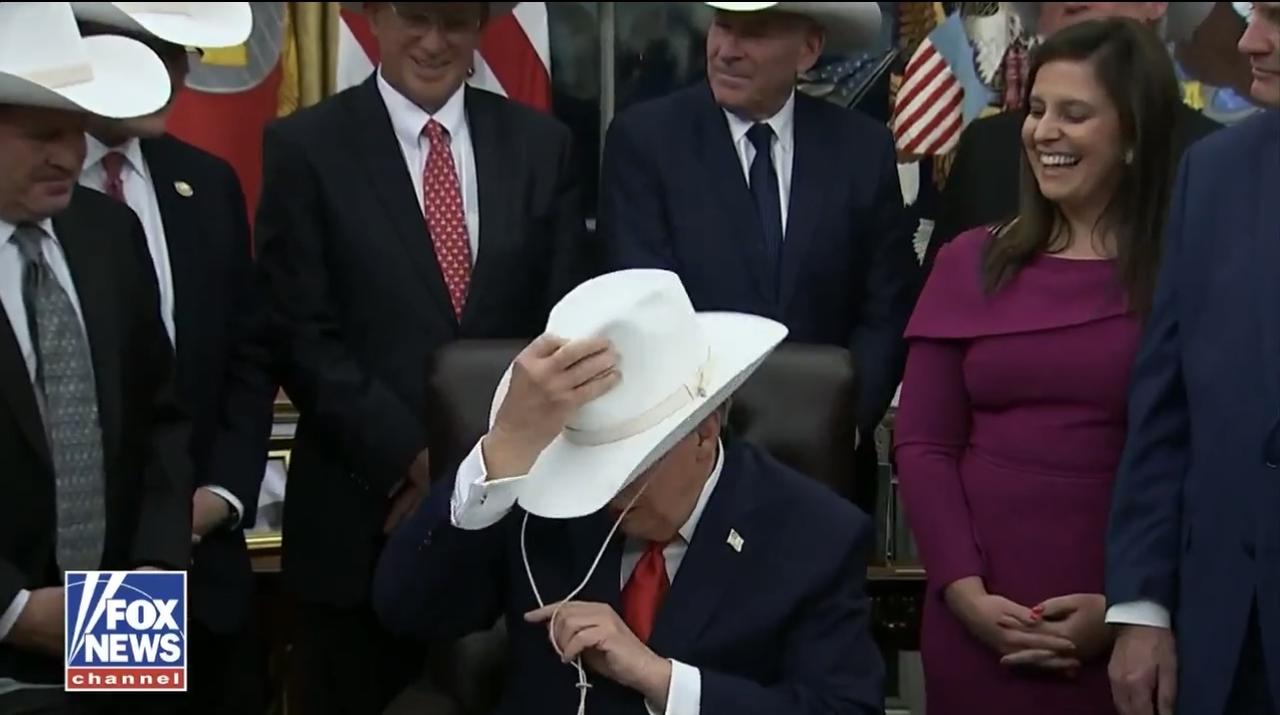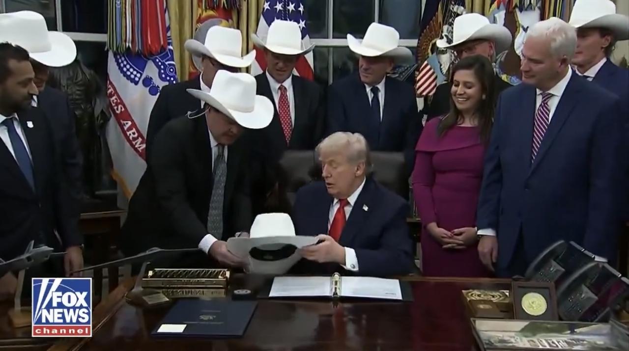 “你一定要拍张照片” 美国冰上奇迹奥运金牌得主代表队成员向特朗普赠送纪念牛仔帽