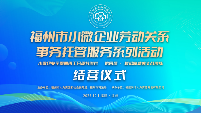12月11日,福州市小微企业劳动关系事务托管服务系列活动——小微企业全周期用工合规特训营(第四期)暨结营仪式圆满落下帷幕。此次活动由福州市人社局和市司法局联合主办、福建淘才人力资源开发有限公司承办,以“模拟仲裁庭”“劳动争议仲裁实务运用”为核心,创新采用“沙龙+特训”的双轨模式,为小微企业提供专业、精准的用工合规指导与服务,助力小微企业构建和谐劳动关系。全市开展小微企业劳动关系事务托管服务试点的100家小微企业负责人、人力资源管理人员,市人社局党组成员、副局长张岩锋,市司法局党组成员、政治部主任林波,市人社局劳动关系处、政策法规处相关同志等120余人参加了本次活动。