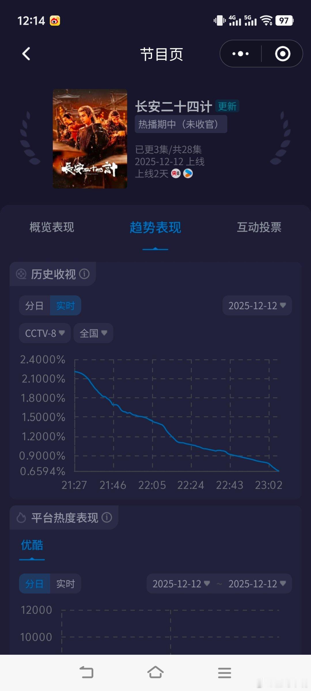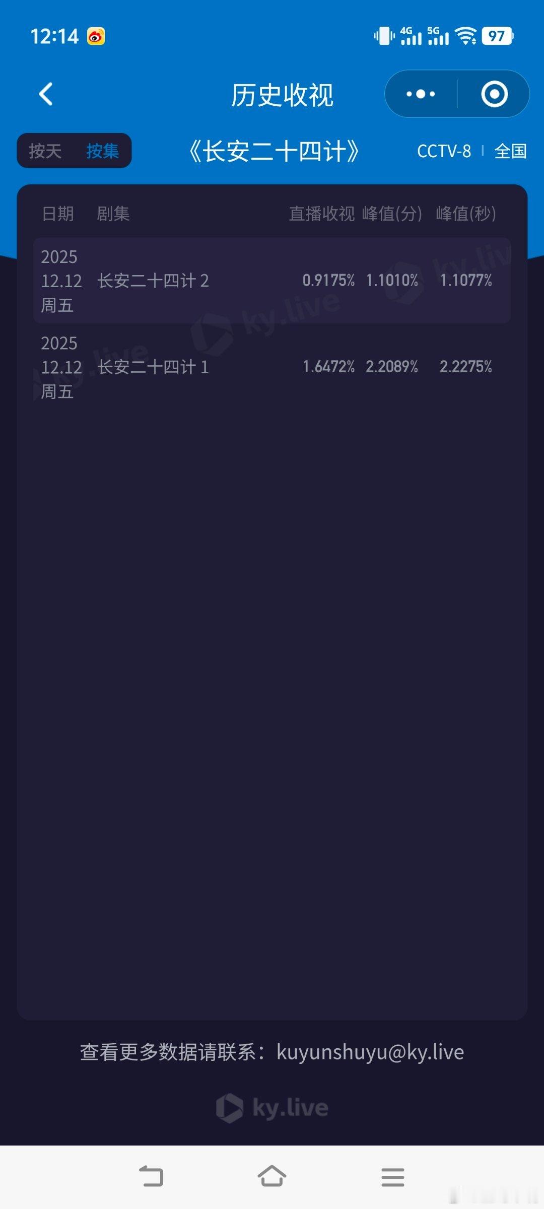 长安二十四计全网收视登顶是时候涛《长安二十四计》的收视率了!可以模拟全剧集均了!昨晚双集平均1.2932(前集1.6472+后集0.9175)来看,可推算如下:第一阶段:12日-19日每天双集,酷云(1.64+0.91)范围波动,cvb估值(前集1.48+后集0.88),共8天!第二阶段:20日-31日,每天1集(前集),每天酷云平均约1.60-1.65之间(参考昨晚前集1.6432),cvb估值1.48左右!共12天!所以28集cvb总和:(1.48+0.88)×8+1.48×12=36.64集均:36.64÷28=1.308结果应该是1.30-1.35之间,大家认为呢?