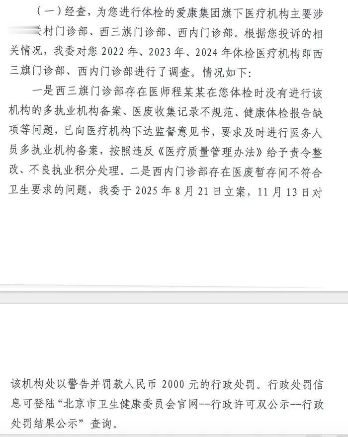 12月12日,记者获悉,一份落款为2025年12月8日、回复张晓玲的《北京市卫生健康委员会答复意见书》显示,爱康国宾旗下两家门诊部存在违规行为,已被处罚。行政处罚虽已落地,但双方关于病历真实性的争议并未解决。