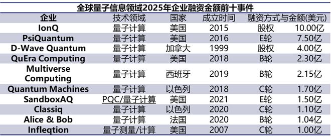 3.2025年量子信息领域市场投融资热度高涨。近十年,全球量子信息领域产业投融资事件达1400余笔,融资金融超145亿美元,其中风险投资占比约67%。今年量子计算明星企业成为资本市场的追捧热点,欧美量子企业在前十融资事件中占据8席,另外2家以色列量子计算企业和欧美生态系统联系紧密。