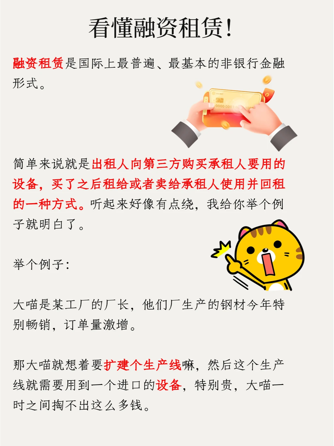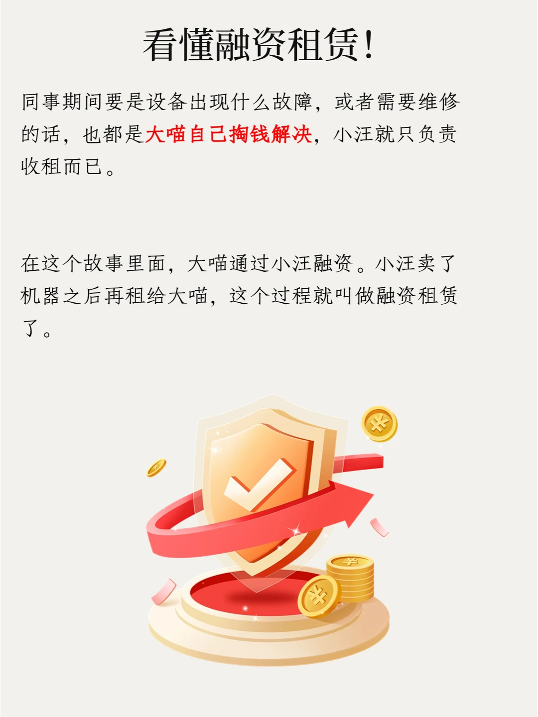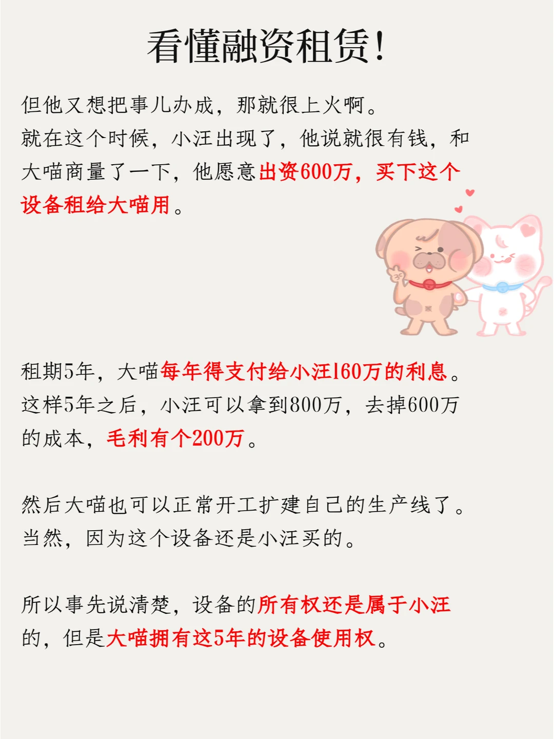 在这个故事里面,大喵通过小汪融资。小汪卖了机器之后再租给大喵,这个过程就叫做荣宗租赁了。