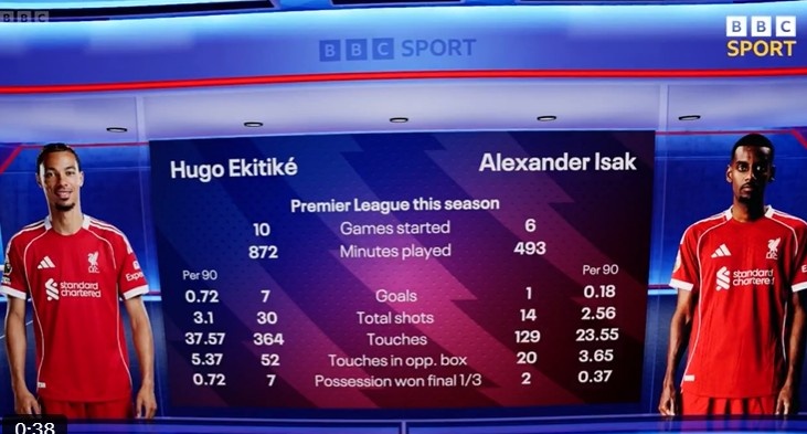 以下为利物浦两大锋线新援埃基蒂克、伊萨克本赛季英超数据对比,具体如下(括号内为每90分钟数据):