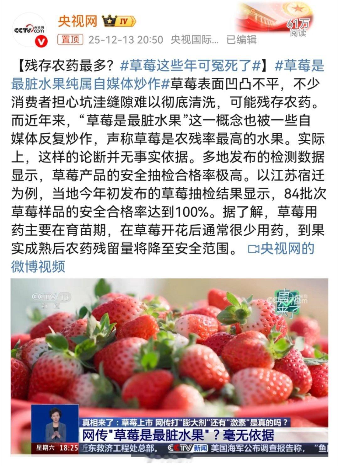 草莓这些年可冤死了草莓是最脏水果纯属自媒体炒作【别再冤枉草莓!“最脏水果”说法无事实依据】草莓表面的凹凸纹理让不少消费者担心农药残留,而“草莓是最脏水果”的说法更是被部分自媒体反复炒作。但事实上,这一论断缺乏科学支撑,多地检测数据已给出明确答案。以江苏宿迁为例,今年初当地发布的草莓质量抽检结果显示,84批次草莓样品的安全合格率达到100%,完全符合国家食品安全标准。从种植逻辑来看,草莓用药主要集中在育苗期,进入开花结果阶段后,农户通常会减少用药,且随着果实成熟,残留农药会自然降解,最终达到安全范围。消费者无需过度焦虑,购买后通过流动清水冲洗等常规方式处理,即可放心食用。谣言的传播不仅误导公众认知,也可能影响农产品市场秩序。科学认知水果安全,不信谣不传谣,才是守护餐桌健康的正确方式。草莓农残谣言澄清