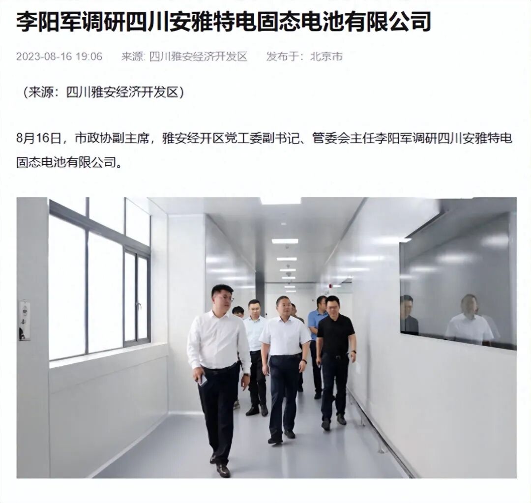 2023年8月16日,雅安市政协副主席,雅安经开区党工委副书记、管委会主任李阳军雅州新区党工委委员、管委会副主任张文涛,党政办、经合局主要负责人调研雅安经济开发区时,并调研了四川安雅特电固态电池有限公司,李阳军实地参观了生产车间,了解企业生产经营、产品研发、市场销售和产业园建设等情况,并与企业负责人深入交流,详细询问企业发展中的困难和问题,积极为企业纾困解难。