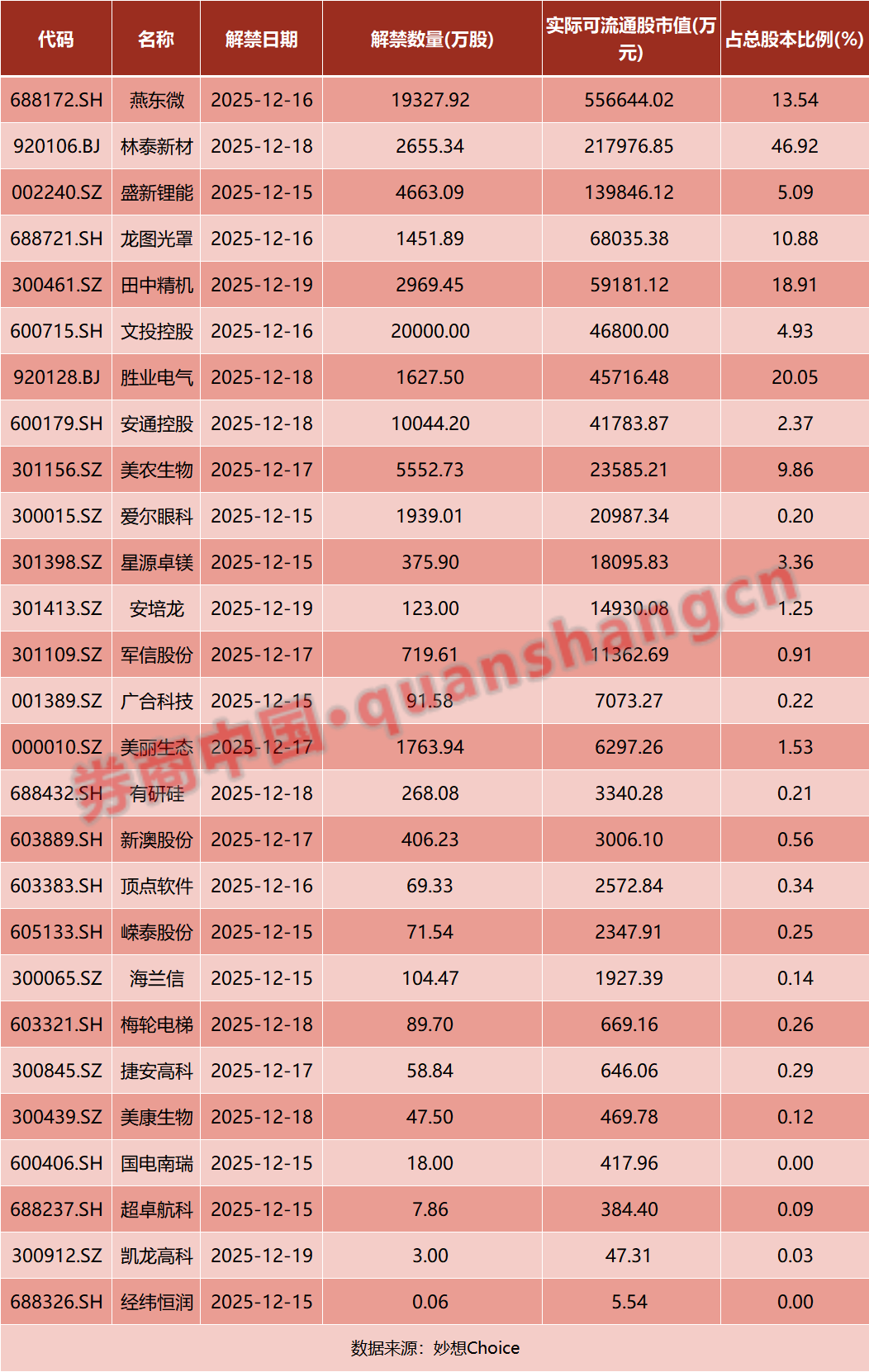 从解禁市值来看,解禁市值居前三位的是:燕东微(55.66亿元)、林泰新材(21.8亿元)、盛新锂能(13.98亿元)。
