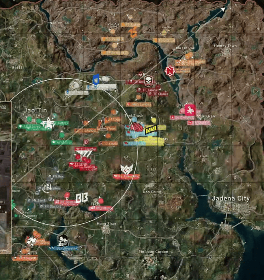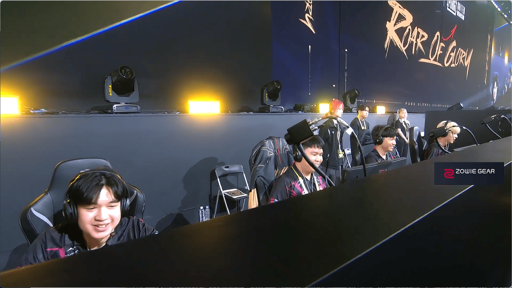 决赛圈,NMG4V2EA,EAJacob依靠房顶枪线优势及手雷率先打掉NMG2人,随后NMG一人绕至蓝圈外侧被听到,随后EA再度打掉NMG一人,最终EA两人汇合在NMG挂后人选锁定至圈边,完成无伤2打4吃鸡。