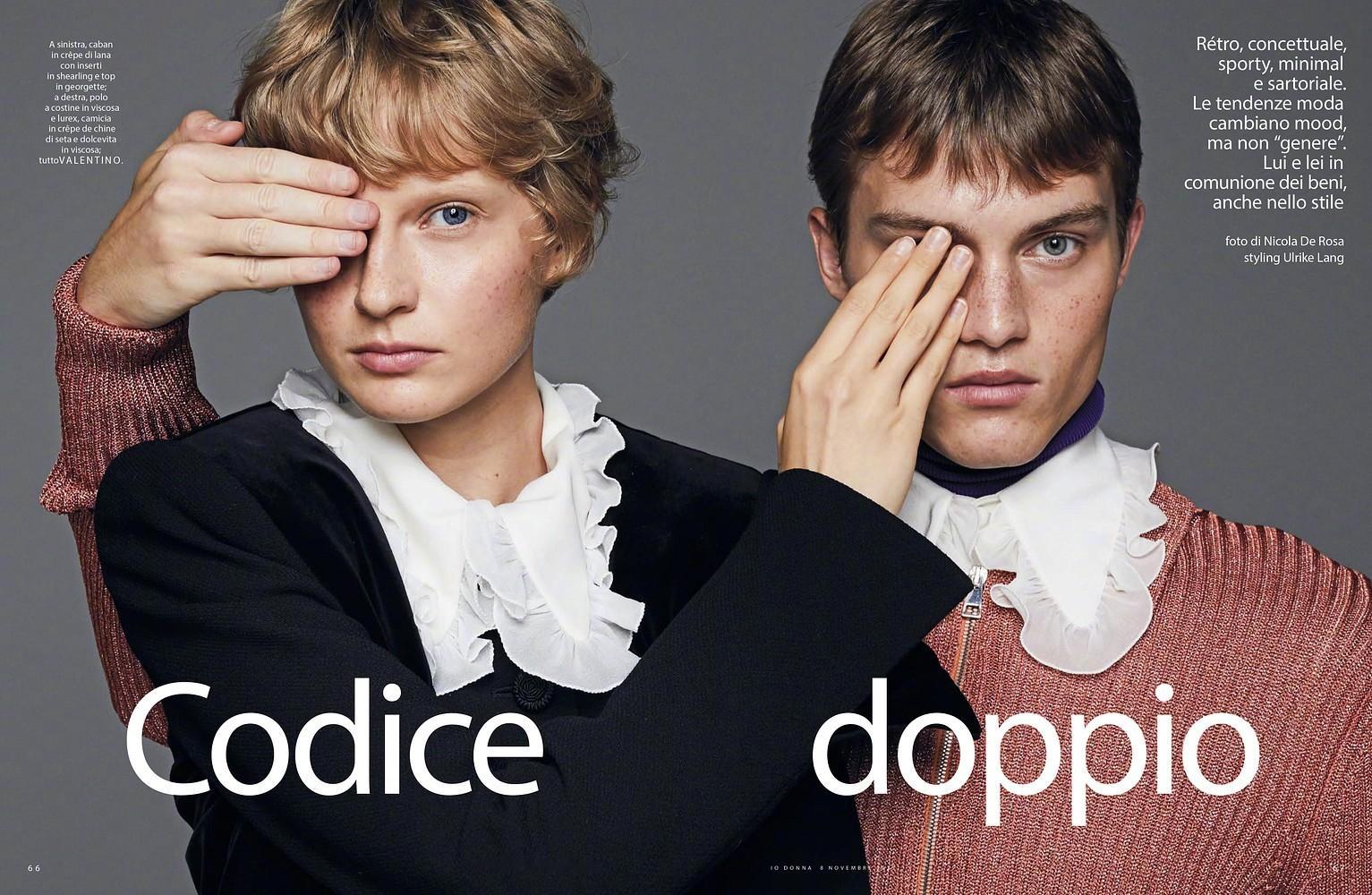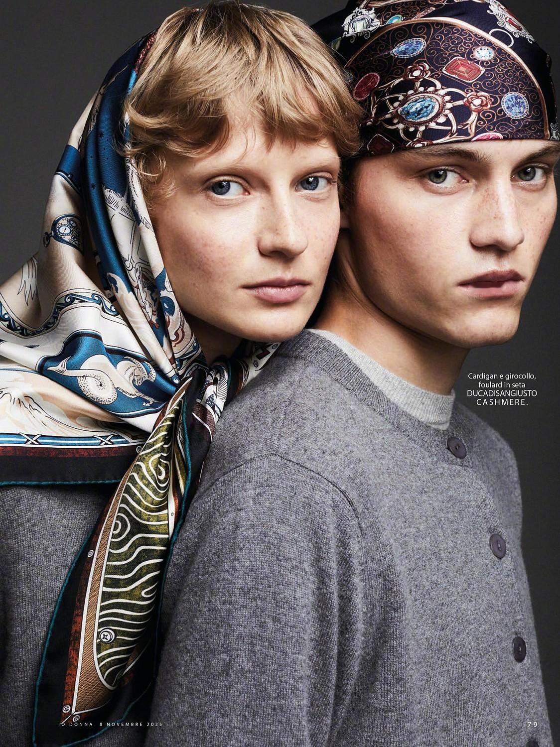 iO Donna November 2025 “Codices Doppio”主题,男女同款造型搭配,很妙的组合呈现。模特: Anna Pavlova & Dominik Datko 摄影: Nicola de Rosa 📷🧶🧣