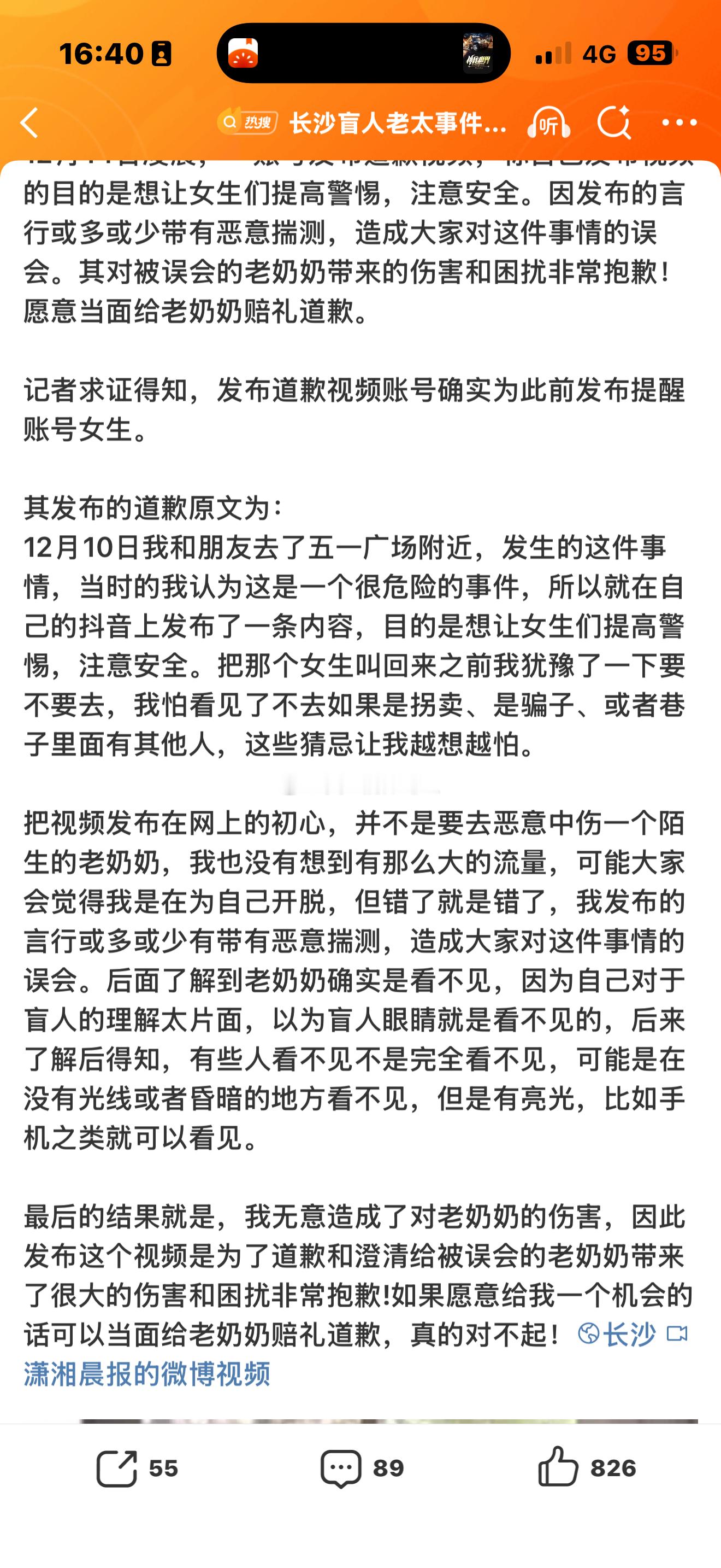 长沙盲人老太事件拍摄者发文道歉我的初心是好的,所以我是好的。至于你受到伤害,那是