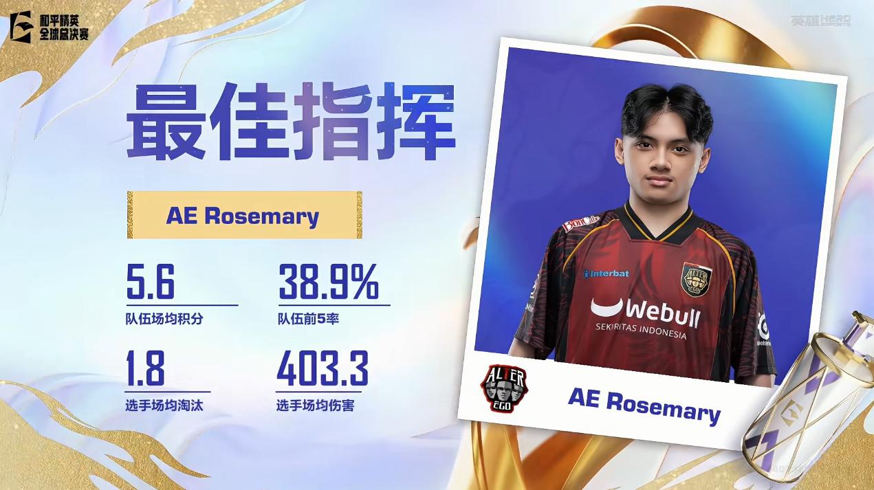 虎扑12月14日讯2025和平精英全球总决赛落下帷幕,AE-Rosemary获得2025和平精英全球总决赛最佳指挥称号!