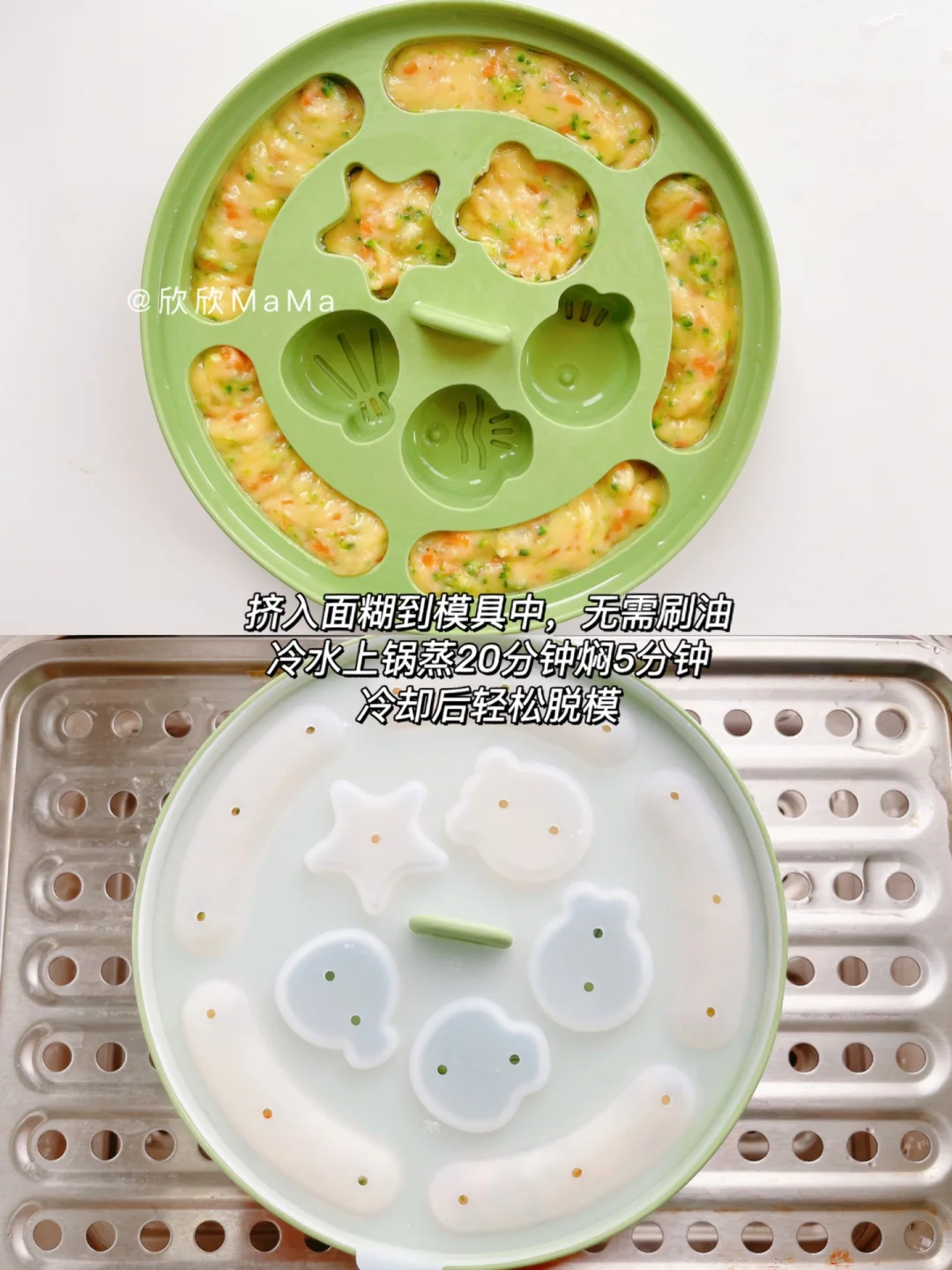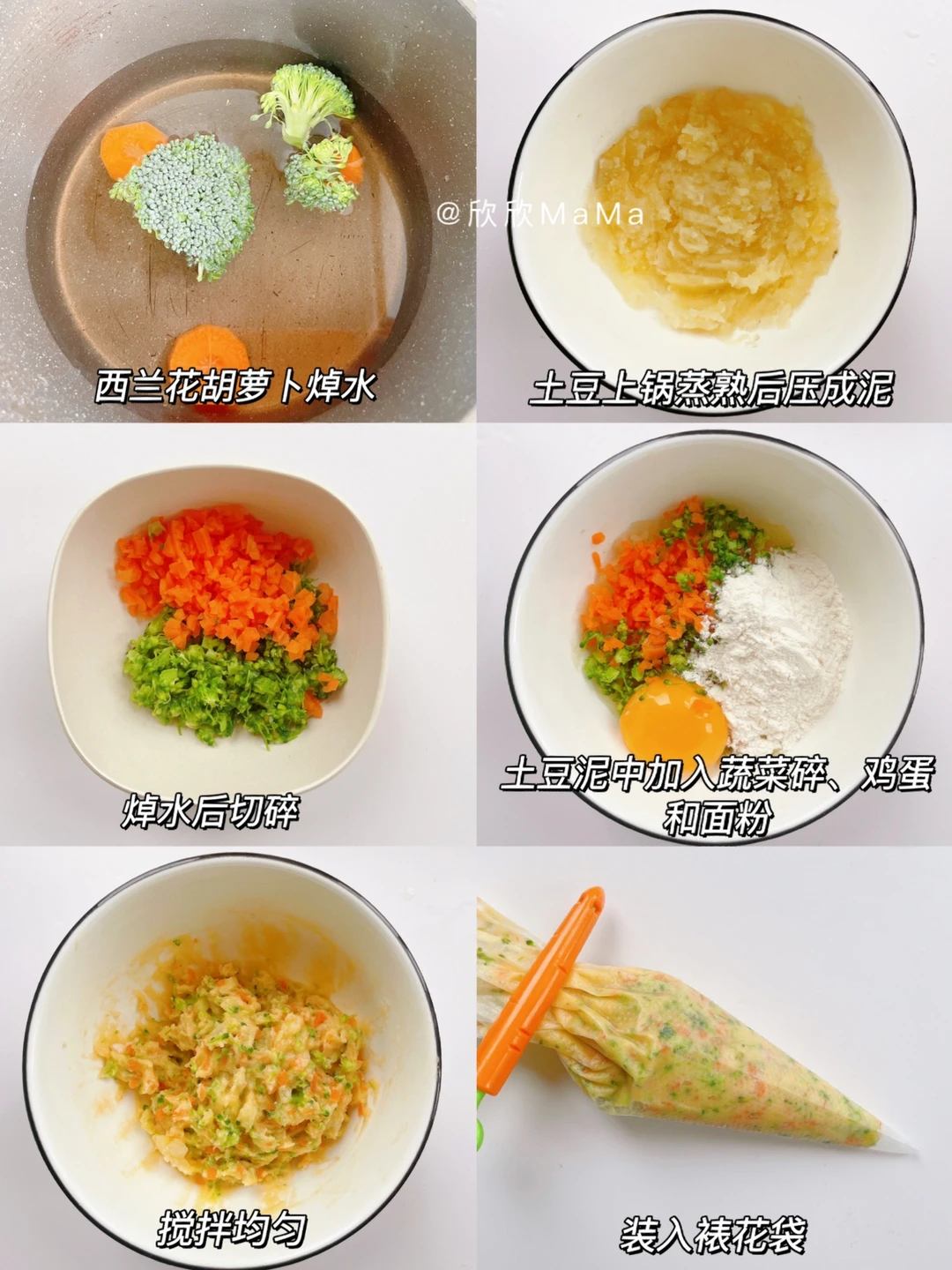 西兰花胡萝卜锅中焯水切碎,土豆上锅蒸熟压成泥,放入蔬菜碎、鸡蛋和面粉搅拌均匀装入裱花袋,挤入模具中,冷水上锅蒸20分钟焖5分钟放凉后脱模