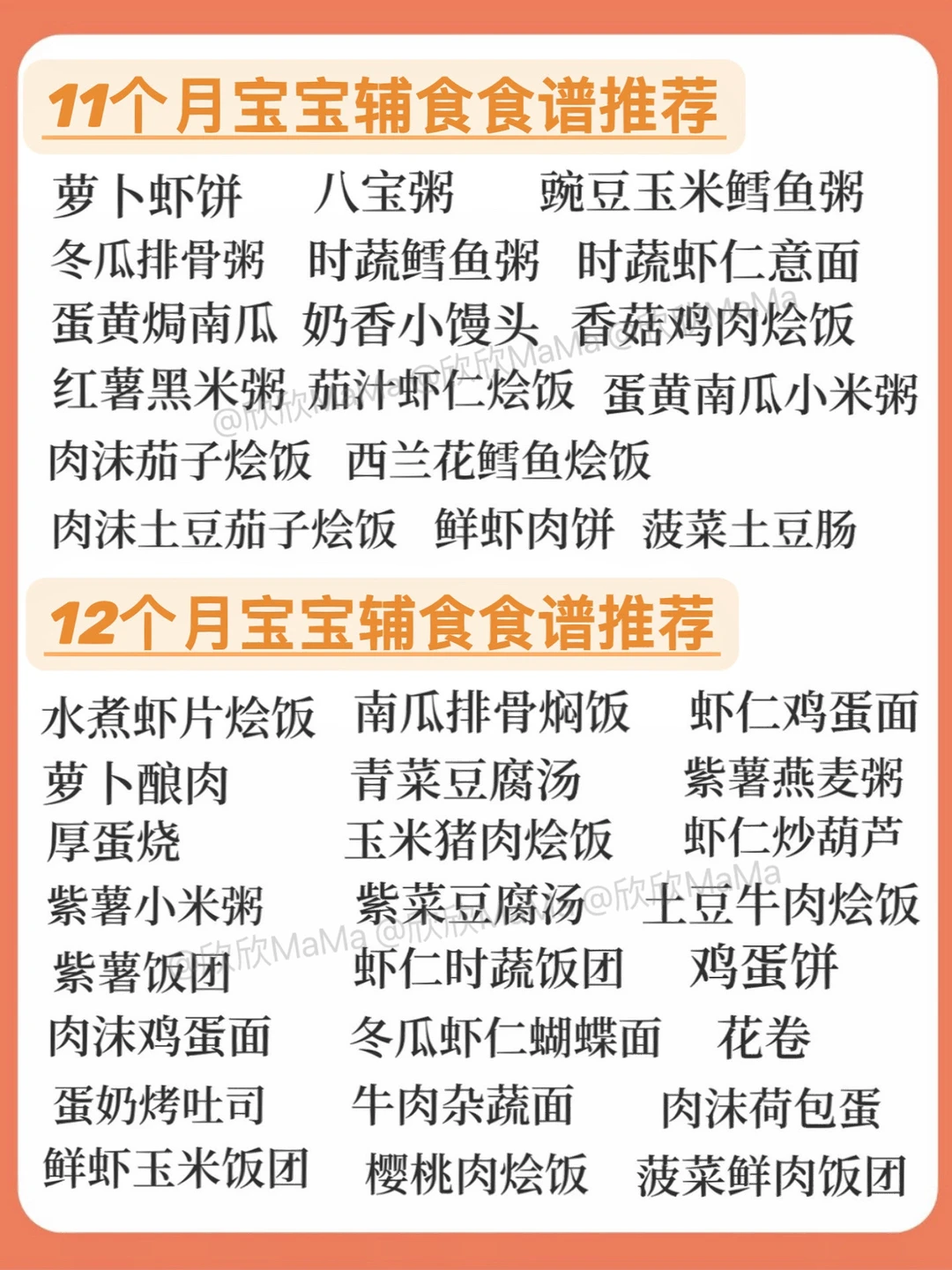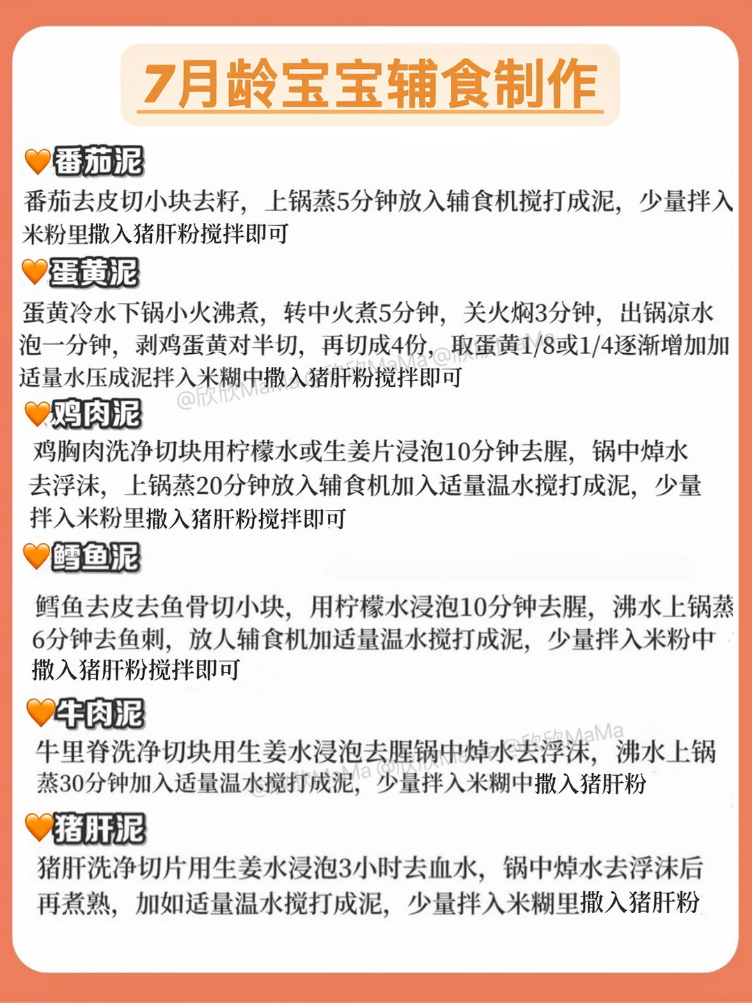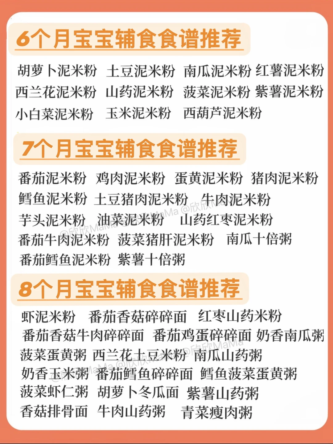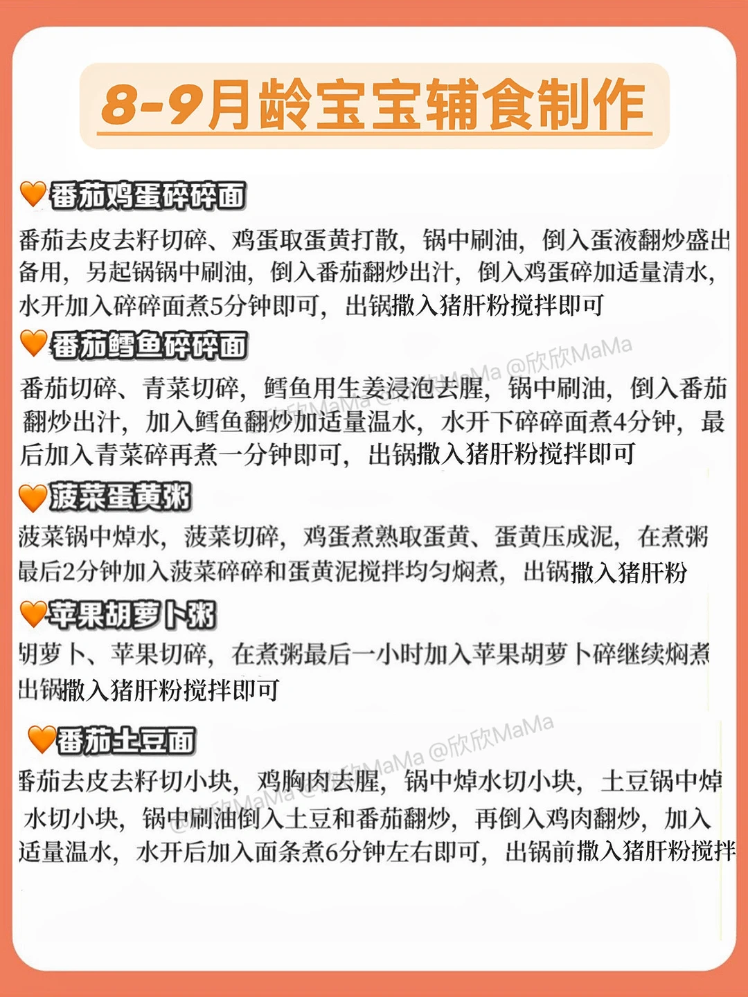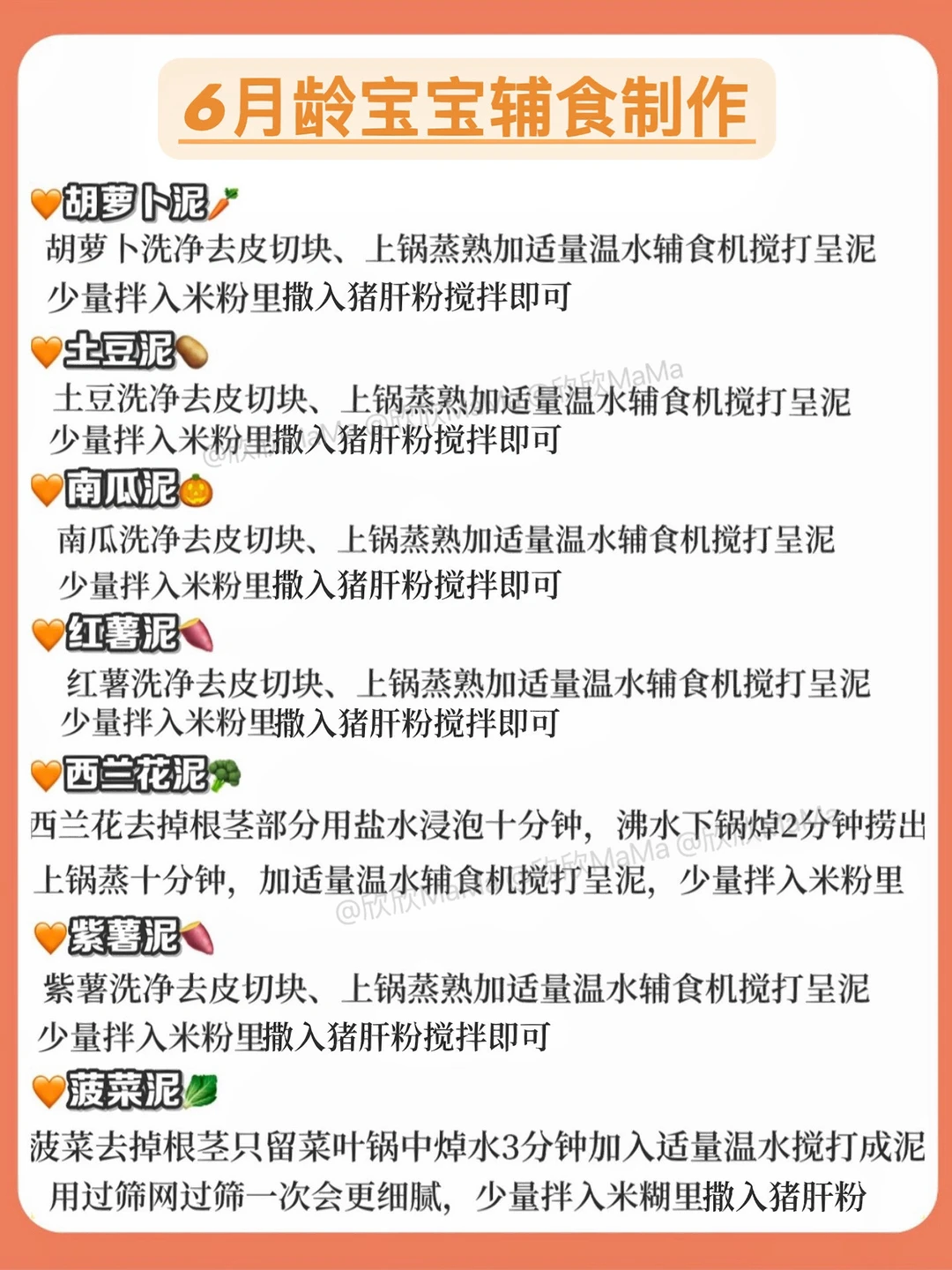 6月龄的宝宝就可以添加辅食了! 今天跟大家分享下6-12月龄宝宝的一些辅食食谱和详细做法,希望整理的资料对你们有帮助 . 🔻米粉冲泡方法 宝宝第一口辅食应该选择高铁米粉 米粉冲泡步骤: 先倒60度温水到碗中,加入适量米粉, 静待30秒,用勺子顺时针搅拌均匀 . 🔻添加辅食顺序 宝宝添加高铁米粉一周后,就可以在辅食里添加蔬菜泥拉.刚开始从根茎泥开始!宝宝添加辅食后容易缺铁,所以给欣欣添加辅食的时候我入手了秋田满满强化铁猪肝粉! 💛它含铁量高,是多倍新鲜猪肝铁含量,而且是三重富铁能更好地被吸收。配料表干净,不添加盐和糖,关键是没有啥腥味,平时加在米糊里或者粥面里都很方便~宝宝更爱吃! . ⚠️ 每添加一种食材3天排敏期,如辅食泥第一天1-2勺,第2天2-3勺逐渐增加拌入米粉里滴入核桃油搅拌食用,水果泥单独吃! . 🔻6月龄宝宝辅食食谱推荐 胡萝卜泥米粉 土豆泥米粉 南瓜泥米粉 西兰花泥米粉 山药泥米粉 菠菜泥米粉 详细🔎请👀图2 . 🔻7月龄宝宝辅食食谱推荐 番茄泥米粉 鸡肉泥米粉 蛋黄泥米粉 猪肉泥米粉 鳕鱼泥米粉 牛肉泥米粉 详细🔎请👀图2 . 🔻8月龄宝宝辅食食谱推荐 虾泥米粉 番茄鸡蛋碎碎面 菠菜蛋黄粥 红枣山药米粉 牛肉山药粥 紫薯山药粥 详细🔎请👀图2 . 🔻9-10月龄宝宝食谱推荐 土豆牛肉粥 番茄鳕鱼粥 南瓜小米粥 鳕鱼青菜粥 番茄牛肉意面 番茄牛肉烩饭 详细🔎请👀图3 . 🔻11-12月龄宝宝辅食推荐 八宝粥 冬瓜排骨粥 玉米粥肉烩饭 虾仁时蔬饭团 紫薯燕麦粥 鸡蛋饼 详细🔎请👀图4 . 整理的资料希望对你们有用,有问题也可以评论区留言哦! 💡关注我带您解锁更多辅食制作