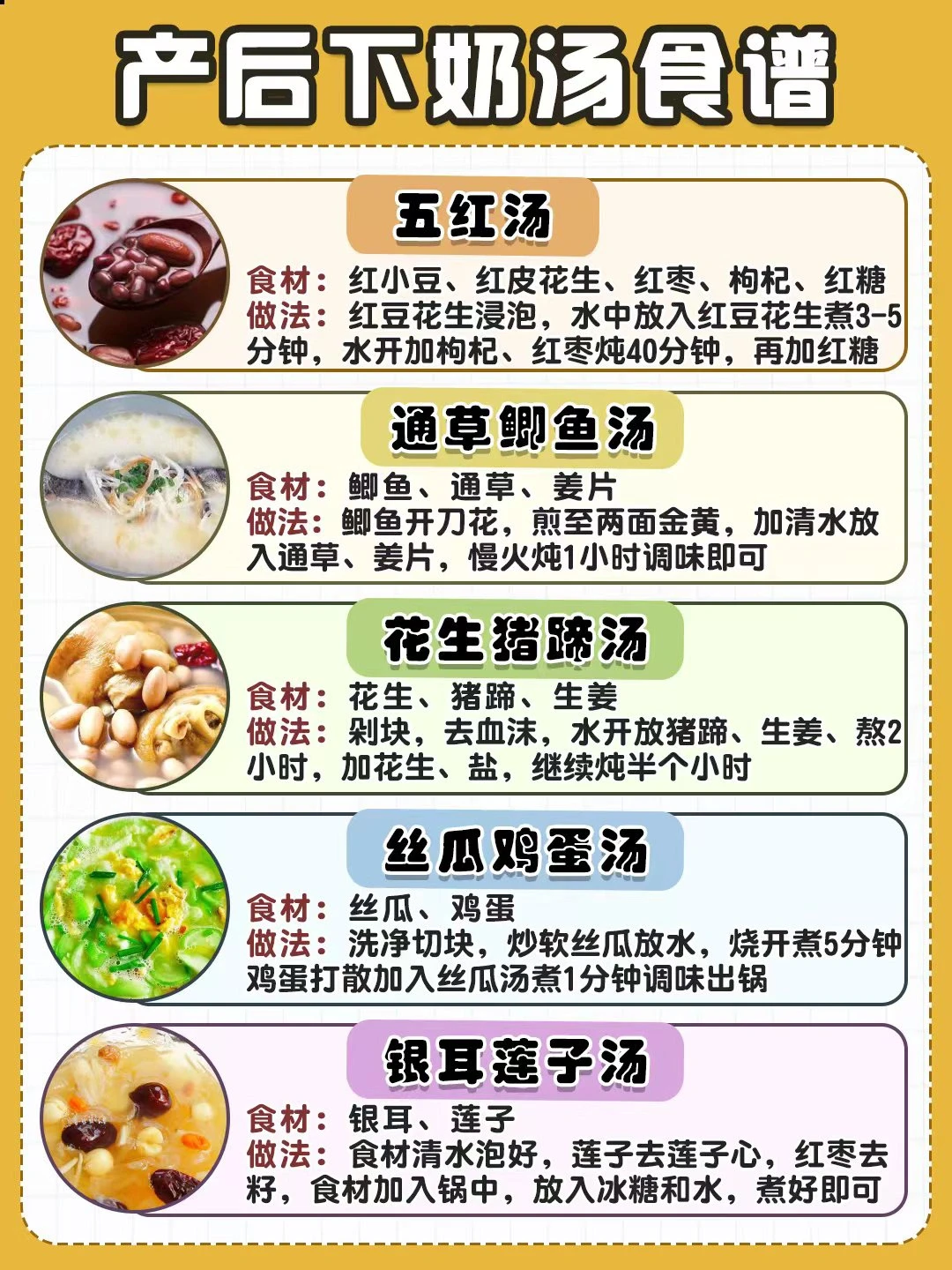 生完前几天,不要吃过于油腻的食物,产后第2⃣️周,再喝下奶汤,荤素搭配合理,均衡营养,保证摄入足够的蛋白质,🈶️利于奶水的分泌,下奶食物看首图‼️好喝下奶汤看图3⃣️