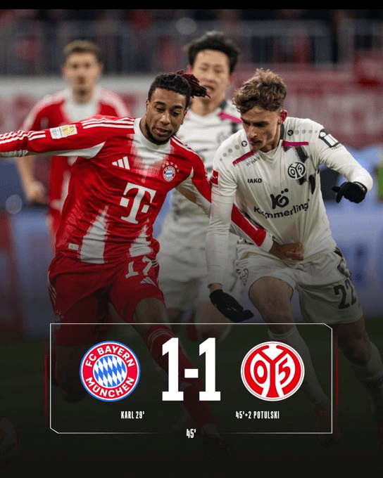 虎扑12月14日讯德甲第14轮,拜仁慕尼黑半场1-1美因茨。