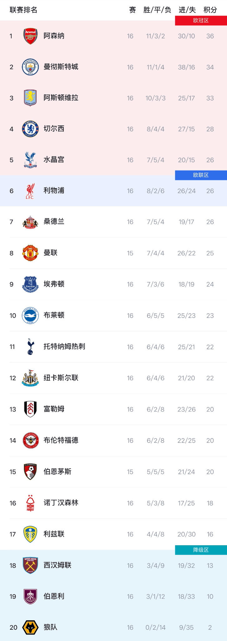 三队在积分榜继续咬得很紧:阿森纳16轮36分领跑,曼城追到34分,维拉拿到33分,争冠集团形成“三队三分差”的局面。‘