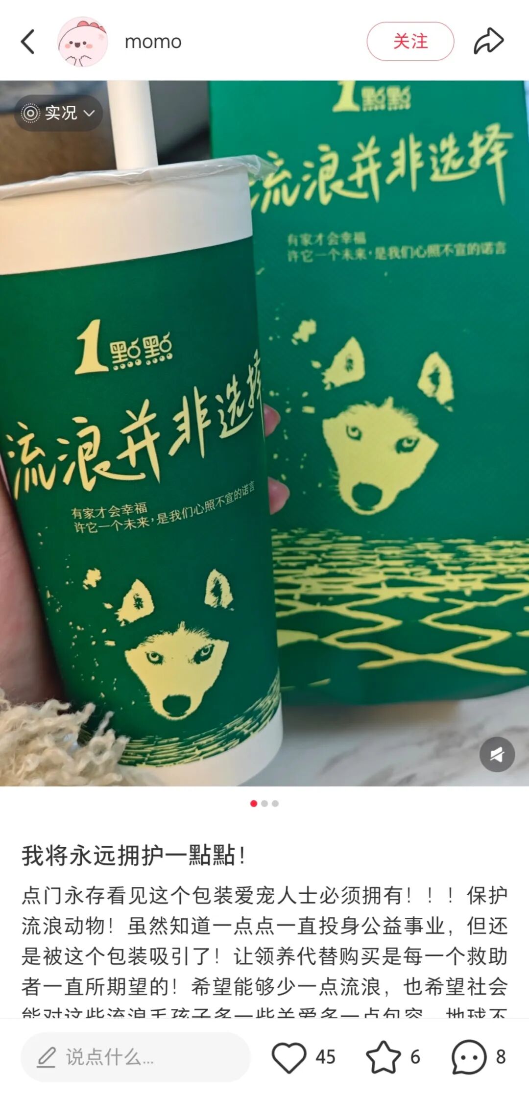 这样的“用消费投票”的看法不单单只有受助组织有,一点点因其流浪动物公益的闻名在社交媒体长期得到大批量的称赞和支持,不少用户自发晒出相关的公益内容,如产品包装上的公益设计、小程序上的积分捐口粮活动,还有其门店自发为流浪猫摆放猫窝的温暖时刻等等。