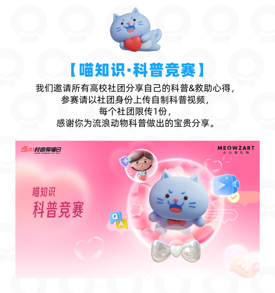以2025年的“5.21校园爱喵日”活动为例,其中设立了摄影、涂鸦、知识科普三大赛道。学生在活动中获奖,不仅个人能获得丰富的奖品,其所在的校园救助社团还可获得数千元的“喵扎特商城”兑换券,用于兑换品牌IP周边。社团将这些周边进行义卖,所得款项作为公益资金用于校园流浪猫救助工作。除个人奖项外,活动还为参与社团设置了包含千元级宠物医疗用品在内的一些实用奖品。
