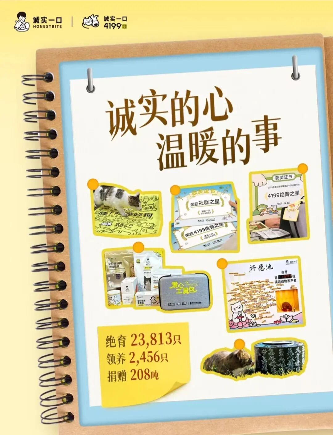 今年1月初,诚实一口4199公益计划累计已完成五期,累计捐赠208吨产品,助力23813只流浪猫狗的TNR(诱捕-绝育-放归)和2456只流浪猫狗的领养,这场计划的影响力和意义已经远远超出了“4199”这个数字符号。