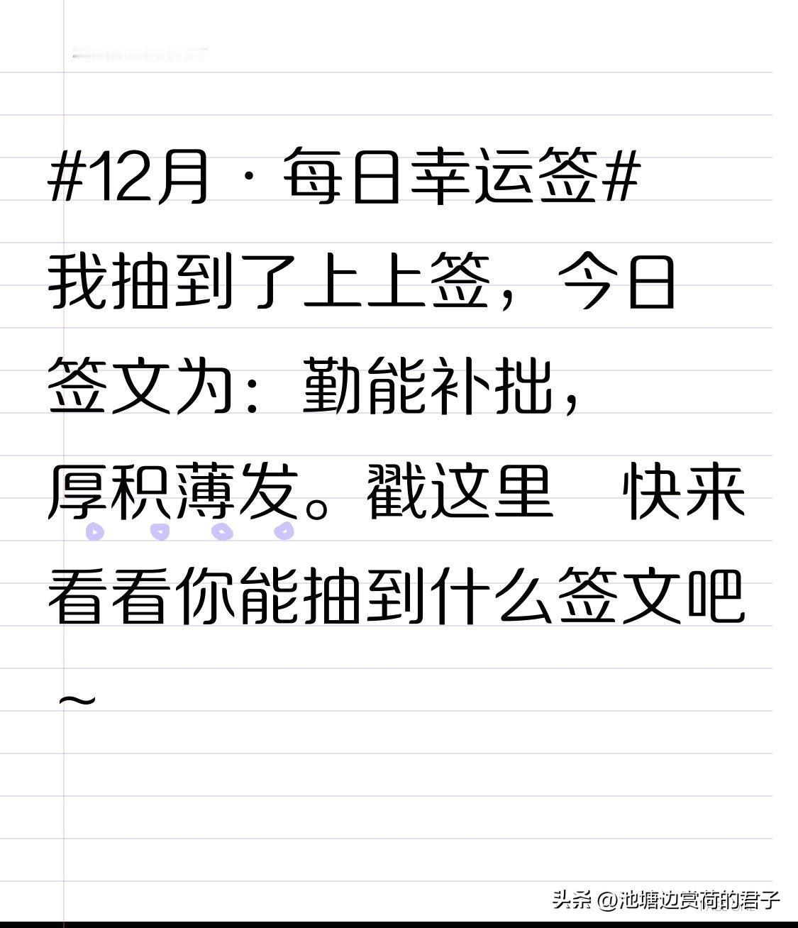 12月·每日幸运签 抽到“勤能补拙,厚积薄发”的上上签,感觉这是12月给我的超棒礼物!这签文就像盏明灯,提醒我得脚踏实地努力。就像杜甫,即便创作《登岳阳楼》时已57岁,身患多种疾病、生活艰难,依然凭借厚积的才华留下经典。他以前就听闻洞庭湖,终于登上岳阳楼时,将心中感慨化作“吴楚东南坼,乾坤日夜浮”这样的千古名句。我也得像他一样,不断积累,勤奋前行。大家也快来抽抽幸运签,说不定有惊喜呢!
