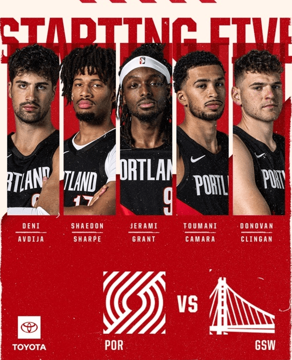 开拓者赛前公布本场首发:杰拉米-格兰特、谢登-夏普、德尼-阿夫迪亚、图马尼-卡马拉、多诺万-克林根。