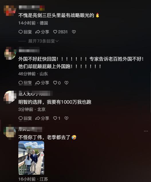 《亮剑》丁伟饰演者王全有去新西兰看望女儿,网友评论区阴阳怪气。 看视频还真是不容易,王全有老两口天黑出门,拎着大包小包的行李,凌晨一点登机去看望女儿。 应该是工作的原因,女儿在新西兰居住,因为看视频王全有女儿的女婿也是亚洲面孔,不像是外嫁到这里。 落地新西兰之后,女儿也是在机场等待接机,看照片,样貌十分漂亮。 不知道是看到镜头害羞还是什么原因,感觉有点拘束。 随后一家人就前往当地的餐厅吃饭,王全有也是给关注他的网友报了个平安。 并向大家介绍了一下他们吃饭的地方,是在一个码头紧挨着落地窗,一转头就能看到大海,挺好的。 感觉没有什么炫耀的意思,反而感觉吃饭的气氛还挺局促,外孙女也不是很黏王全有,这可以理解,毕竟隔着这么远见面机会少。 女儿女婿在视频中感觉话也很少的样子。总之感觉气氛不像是久未团聚的样子。 但是网友在看了之后,却在评论区阴阳怪气起来。 “原来新一团的新是新西兰的新”;“不愧是亮剑三巨头里最有眼光的”;“为国家辛苦一辈子了是时候出去享福了”。 像这样的评论还有很多,语气中透露着满满的阴阳骨气,里外里的就是在说王全有跑到国外享福了。 看王全有收拾的行李数量,应该是要过去长住一段时间,但并没有说定居。 应该不是网友嘴里阴阳的这种意思。