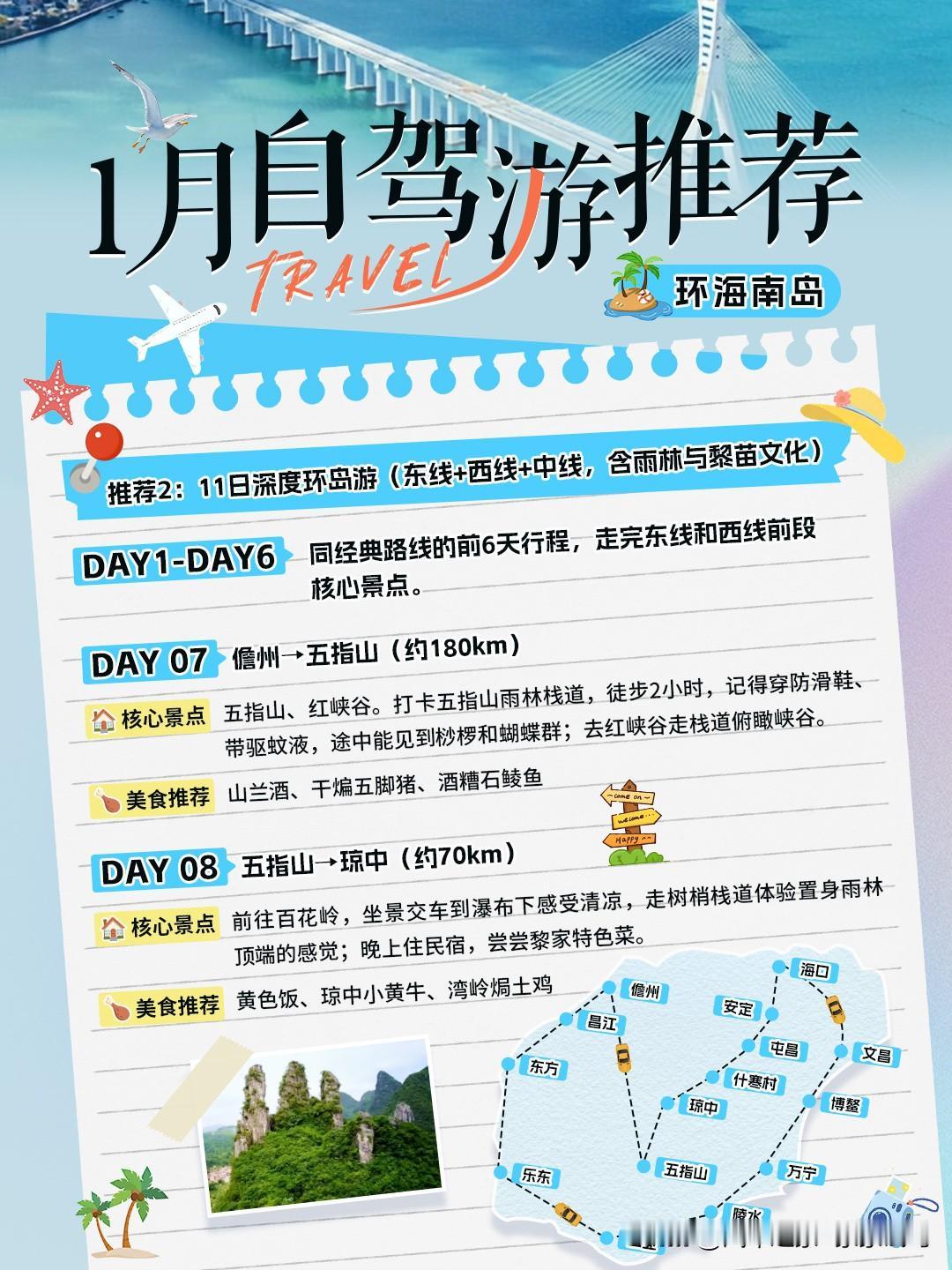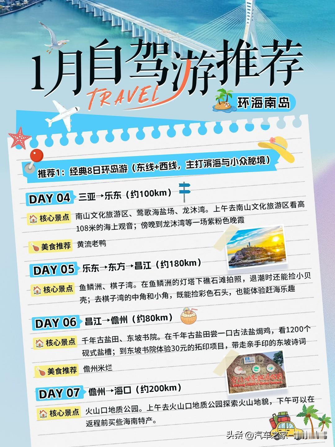 北方裹着厚衣仍冻得瑟瑟发抖,三亚却凭着和煦暖阳,稳稳承包整个冬天的舒适与自由!没错!家家1月的自驾游推荐就是环海南岛! 自驾海南岛既能灵活安排行程,又能尽情欣赏沿途风景,常规路线是串联东线、西线,若想体验雨林与民族风情,可加入中线行程。下面家家为你推荐两种经典玩法,涵盖景点、美食和行程规划,适配不同游玩需求! 一、经典 8 日环岛游(东线+西线,主打滨海与小众秘境) 这条路线适合偏爱海景、想兼顾热门景点和原生态风光的游客,东线景点密集热闹,西线人少景野,节奏张弛有度。 Day1海口→文昌(约80km) 核心景点:骑楼老街、铜鼓岭、月亮湾。敲黑板!铜鼓岭下午4点后上山,俯瞰像蓝丝带的月亮湾。 美食推荐:盐焗鸡、抱罗粉。 Day2文昌→琼海→万宁(约160km)核心景点:博鳌玉带滩、日月湾。可在博鳌玉带滩看三江入海口奇观,不用进会址也能去 “海的故事”酒吧街打卡;到日月湾找持证教练体验冲浪,约300元/2小时。 美食推荐:和乐蟹、后安粉。 Day3万宁→陵水→三亚(约150km)核心景点:石梅湾、分界洲岛、亚龙湾。在石梅湾的凤凰九里书屋边看海看书,点杯兴隆咖啡;分界洲岛上午喂魔鬼鱼,划重点!冬季受风浪影响,海鱼出没频率大幅降低,大家出行前记得多做功课、备好攻略。下午看海豚表演;晚上去亚龙湾逛沙滩,非常出片的一天! 美食推荐:椰子鸡、芒果炒冰。 Day4三亚→乐东(约100km)核心景点:南山文化旅游区、莺歌海盐场、龙沐湾。上午去南山文化旅游区看高108米的海上观音;傍晚到龙沐湾等一场紫粉色晚霞。 美食推荐:黄流老鸭。 Day5乐东→东方→昌江(约180km)核心景点:鱼鳞洲、棋子湾。在鱼鳞洲的灯塔下礁石滩拍照,退潮时还能捡小贝壳;去棋子湾的中角和小角,既能捡彩色石头,也能体验赶海乐趣。 Day6昌江→儋州(约80km)核心景点:千年古盐田、东坡书院。在千年古盐田尝一口古法盐焗鸡,看1200个砚式盐槽;到东坡书院体验30元的拓印项目,带走亲手印的东坡诗词。美食推荐:儋州米烂。 Day7儋州→海口(约200km)核心景点:火山口地质公园。上午去火山口地质公园探索火山地貌,下午可以在返程前买些海南特产。 二、11日深度环岛游(东线+西线+中线,含雨林与黎苗文化) 若时间充裕,可在经典路线基础上加入中线,解锁海南的雨林与民族风情,行程更丰富: Day1-Day6:同经典路线的前6天行程,走完东线和西线前段核心景点。 Day7:儋州→五指山(约180km):打卡五指山雨林栈道,徒步2小时,记得穿防滑鞋、带驱蚊液,途中能见到桫椤和蝴蝶群;也可去红峡谷走栈道俯瞰峡谷。 美食可尝试本地野菜、山兰酒。 Day8:五指山→琼中(约70km):前往百花岭,坐景交车到瀑布下感受清凉,走树梢栈道体验置身雨林顶端的感觉;晚上住民宿,尝尝黎家特色菜。 Day9:琼中→什寒村(约50km):什寒村海拔较高,可围炉煮茶听黎族阿妹讲故事,体验黎苗民宿的静谧,还能采购黎锦等手工艺品。 Day10:什寒村→屯昌(约120km):去屯昌品尝特色黑猪肉火锅和粉汤,若时间充裕可逛逛本地集市,感受乡村风情。 Day11:屯昌→定安→海口(约100km):在定安久温塘冷泉泡脚解乏,再去文笔峰感受道教文化;晚上返回海口。 最后,家家再给一个租车小贴士~ 推荐海口租车,比三亚便宜,选全险避免刮蹭纠纷,取车时拍视频记录车况和油量;西线加油站间隔远,油表过半就及时加油。 三亚旅游 海南岛旅游 海南旅游自驾