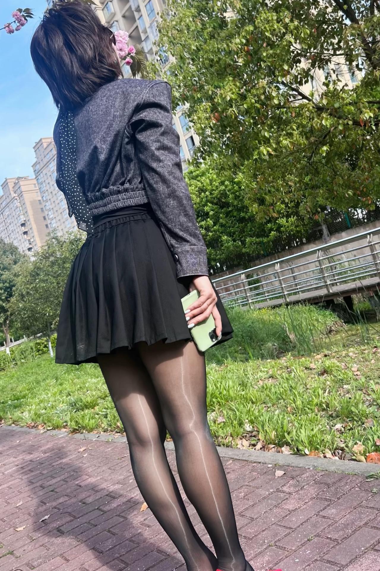都市女孩的优雅穿搭,黑裙与绿植的完美结合。