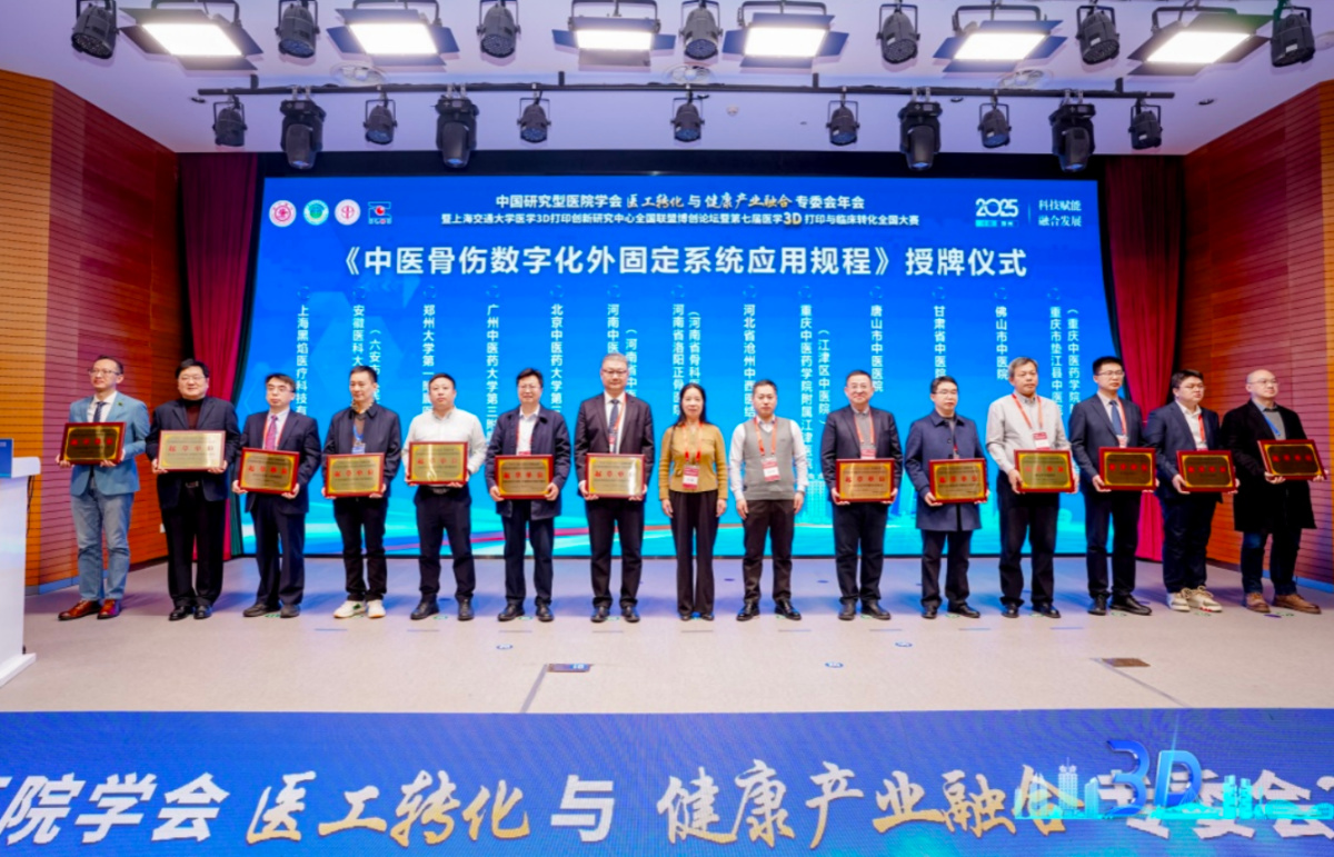 中国国际科技促进会标准化工作委员会副主任马利豪宣读《关于团体标准发布的公告》。该标准由河南省洛阳正骨医院(河南省骨科医院)牵头制定,填补了中医骨伤数字化外固定领域的标准空白,13家单位成为首批标准应用示范单位并获授牌,将共同推动标准落地实施,规范技术应用流程。
