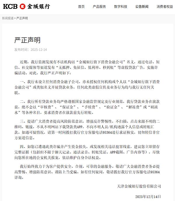 人民网天津12月15日电(记者崔新耀)记者今天从金城银行官方网站获悉,近期,金城银行监测发现有不法机构以“金城银行旗下消费金融公司”名义,通过电话、短信、社交媒体等渠道发布“无抵押、免征信、低利率、秒到账”等虚假贷款广告,实施诈骗活动。对此,金城银行发布《严正声明》。