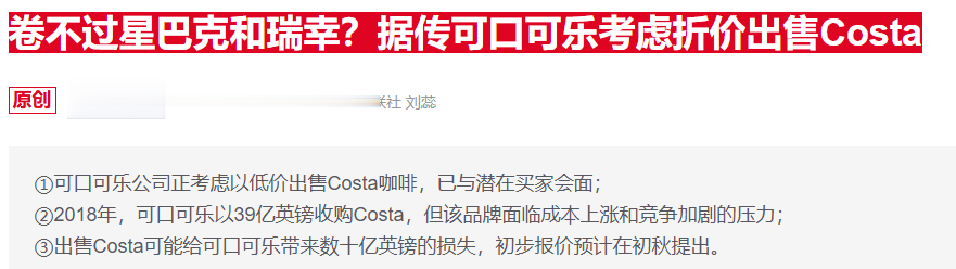 2018年,可口可乐以39亿英镑从Whitbread手中收购了Costa。但此后,该部门在与独立咖啡店以及Greggs等对手的竞争中表现不佳。
