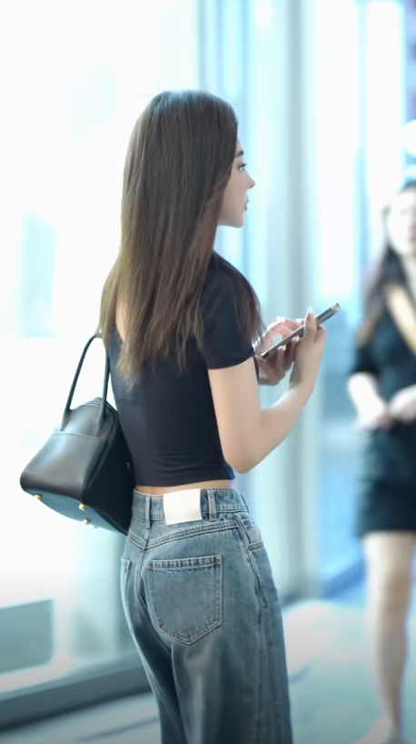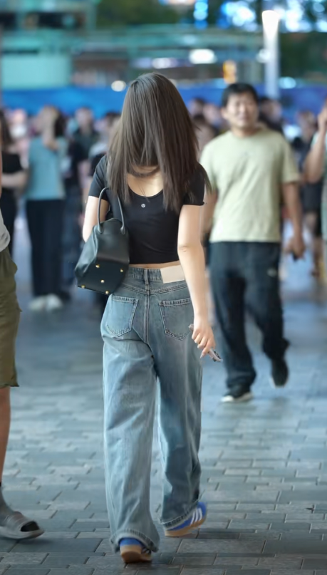 下身搭配一条浅蓝色的阔腿牛仔裤,宽松的版型不仅修饰出她笔直修长的双腿,更增添了几分随性与大气。脚上穿着一双蓝色的鞋子,与裤子的颜色相呼应,整体搭配和谐又时尚。