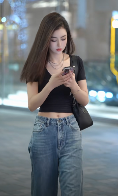 她的皮肤白皙细腻,如同刚剥壳的鸡蛋一般,散发着健康的光泽。身材更是令人称羡,比例完美,线条流畅。她上身穿着一件黑色短款上衣,简洁的设计恰到好处地露出她那平坦的小腹,展现出青春的活力与自信。