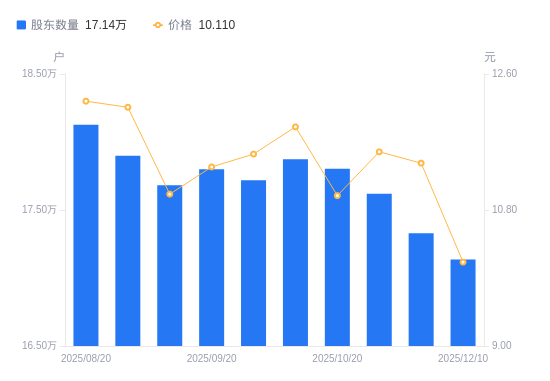 日期A股户数(户)流通A股户均持股数(股)户均持股市值(万元)2025-12-1017136413452.0913.602025-11-1017329713302.0415.192025-10-3117619013083.6315.142025-10-2017804112947.6014.232025-10-1017874012896.9715.352025-09-3017718013010.5215.012025-09-2017800012878.7914.642025-09-1017682212964.5914.272025-08-2917899112807.4815.572025-08-2018126312646.9515.48