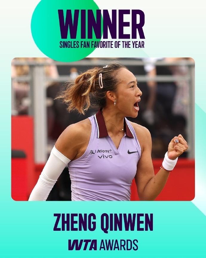 蝉联人气女王!WTA:郑钦文连续两年当选最受欢迎单打女球员