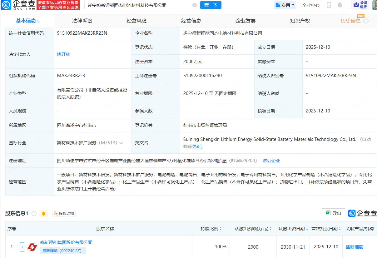 企查查APP显示,近日,遂宁盛新锂能固态电池材料科技有限公司成立,法定代表人为姚开林,注册资本为2000万元,经营范围包含:新材料技术研发;新材料技术推广服务;电池制造;电池销售;电子专用材料研发等。企查查股权穿透显示,该公司由盛新锂能(002240)全资持股。