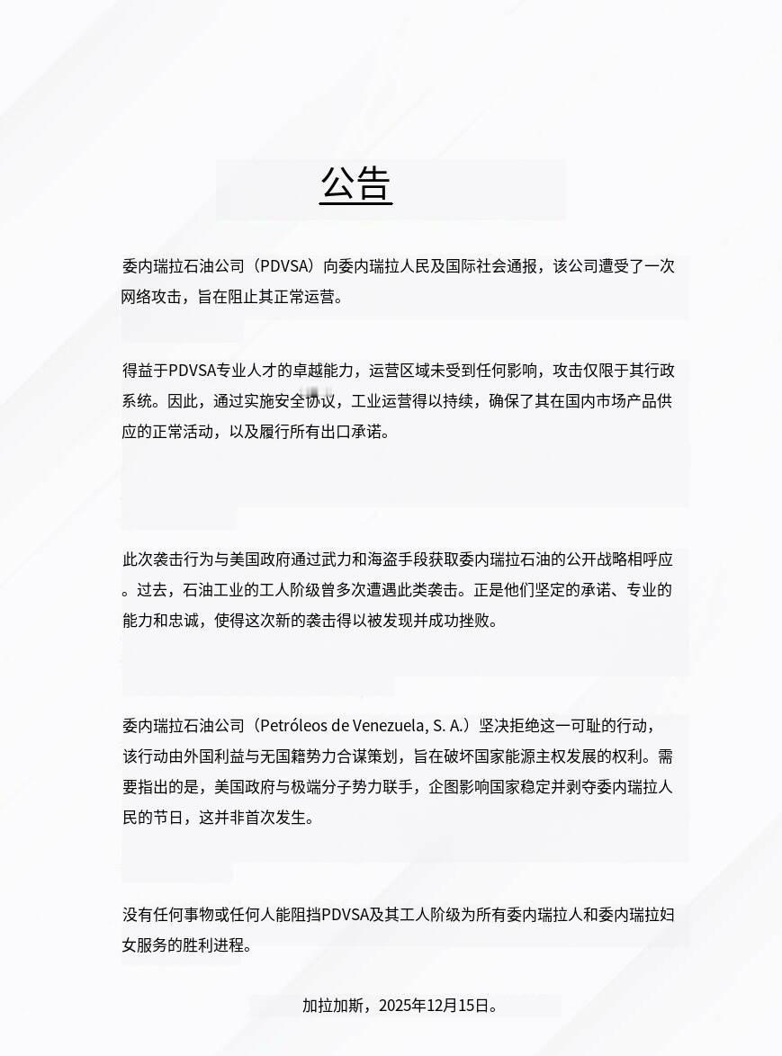 新闻快讯——委内瑞拉国家石油公司(PDVSA)谴责针对本国的“网络攻击”,称该攻击旨在“瘫痪公司运营”。 该公司表示:“此次攻击企图,是美国政府通过武力与海盗行径掠夺委内瑞拉石油这一公开战略的又一组成部分。”