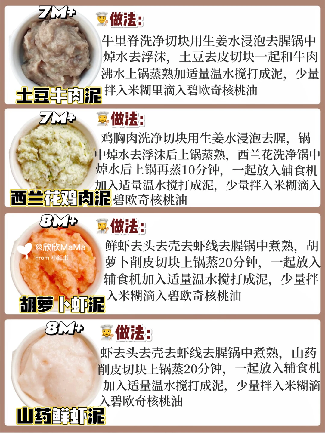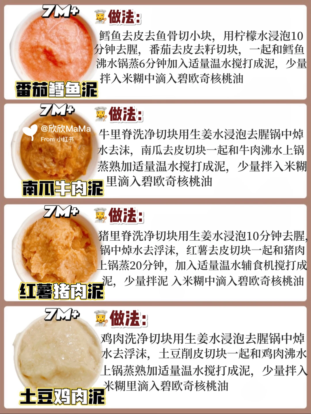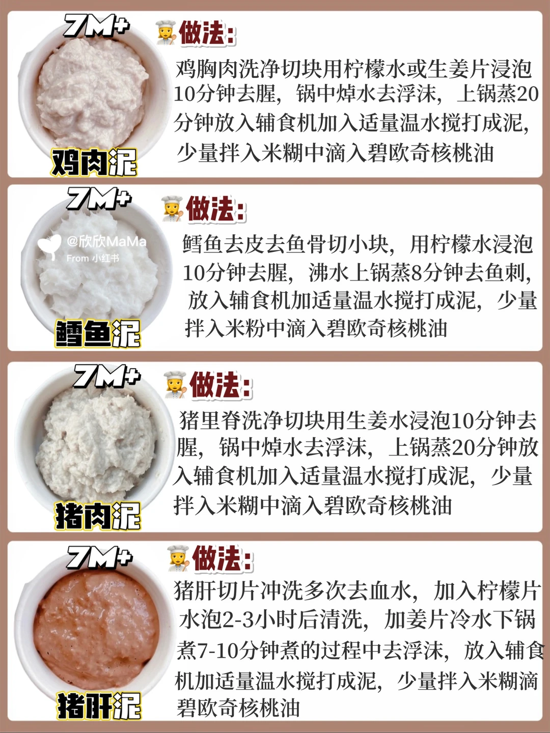 ⚠️宝宝第一口肉泥建议先吃白肉再吃红肉,依次顺序鸡肉泥👉猪肉泥👉鱼泥等,每次我做完辅食都要滴入辅食油!