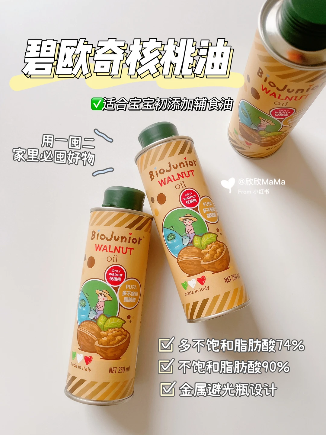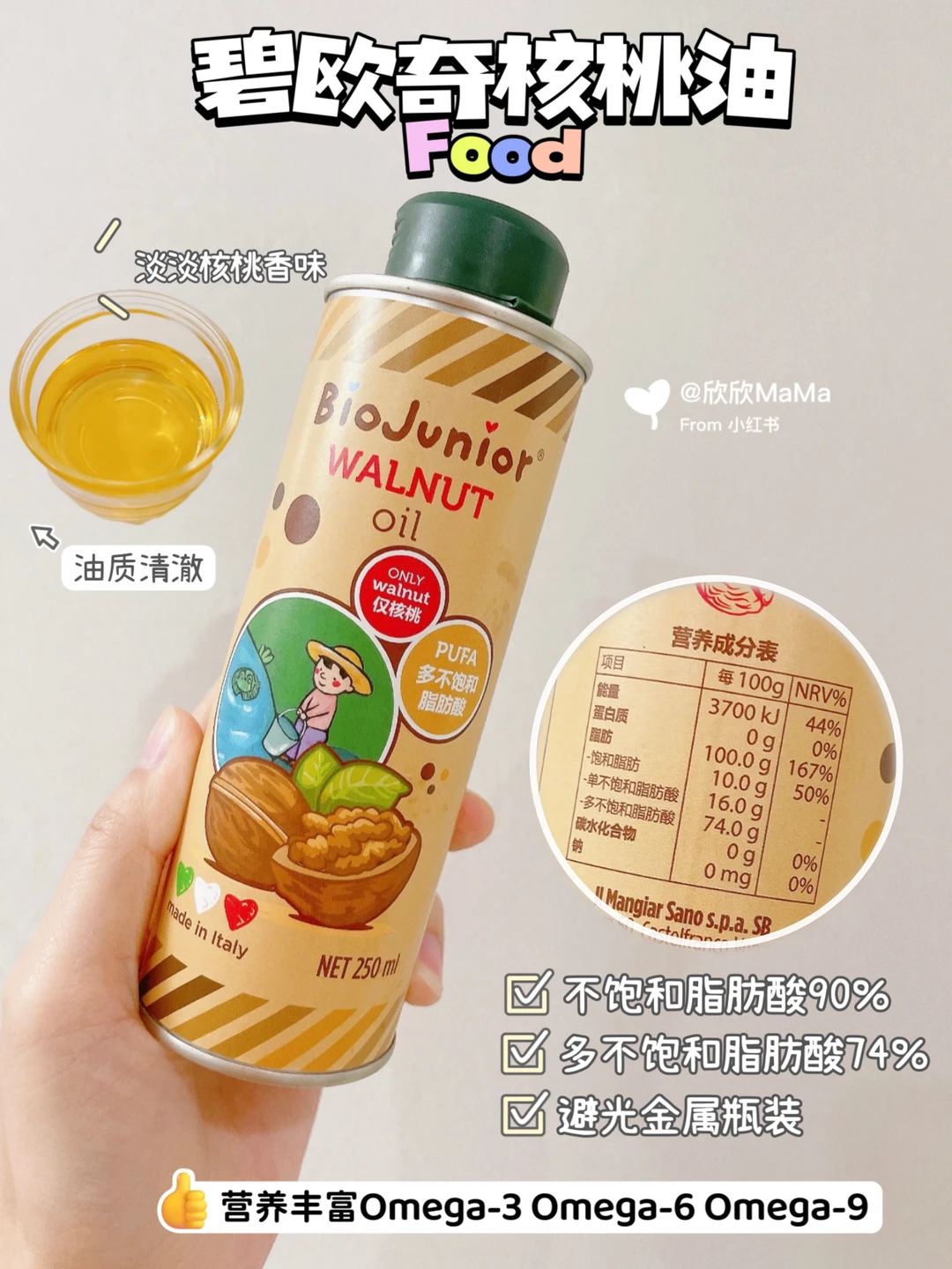 🔻我们家一直在吃的就是碧欧奇核桃油,油脂纯净没有杂质,淡淡的核桃清香,平时直接加入宝宝的辅食中,比如说米糊,粥,面条等、亚油酸及 Omega-3符合4-6:1黄金比例,作为初添加宝宝的辅食油很适合,在辅食中滴几滴,营养又健康~而且它是金属包装,能百分百完美避光,可以更好的保存保证营养的不流失,辅食油中的omega3、6非常畏光,容易发生光反应,产生有害物质,像这样的金属避光罐,妈妈们使用起来根本不用担心这个问题啦~