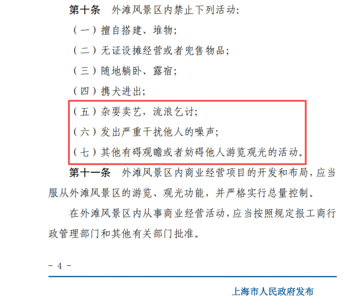 记者通过上海市人民政府官网查阅《上海市外滩风景区综合管理暂行规定》(以下简称规定)获悉,外滩风景区内禁止下列活动:(一)擅自搭建、堆物;(二)无证设摊经营或者兜售物品;(三)随地躺卧、露宿;(四)携犬进出;(五)杂耍卖艺,流浪乞讨;(六)发出严重干扰他人的噪声;(七)其他有碍观瞻或者妨碍他人游览观光的活动。