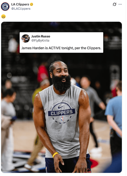 赛前,快船社媒转发快船记者JustinRusso关于哈登确认今日出战的新闻,并配上:微笑的表情包。